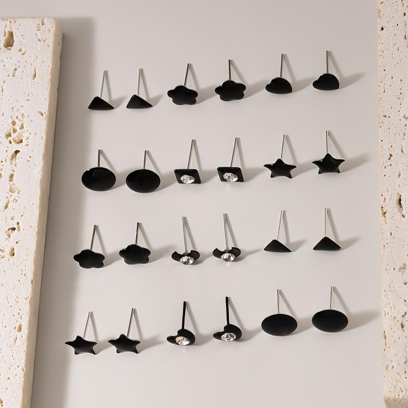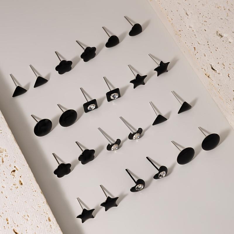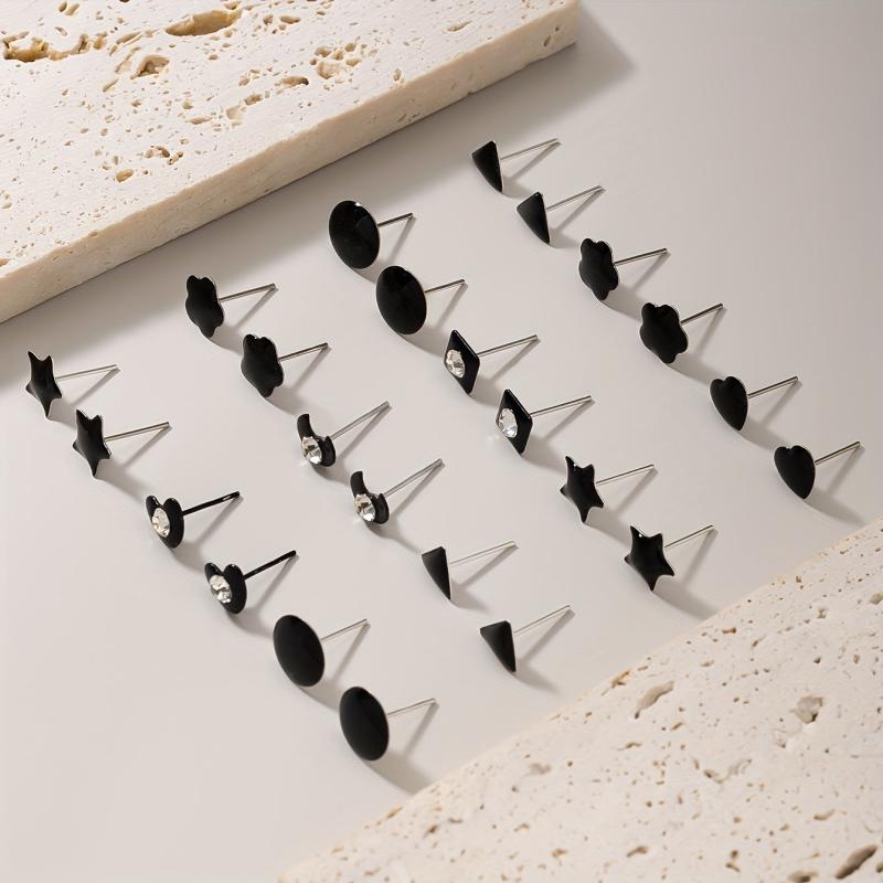 Add a touch of glamour to your look with this set of 12 pairs of stud earrings featuring heart, clover, and star rhinestone accents. Perfect for daily wear or as a gift for someone special.
