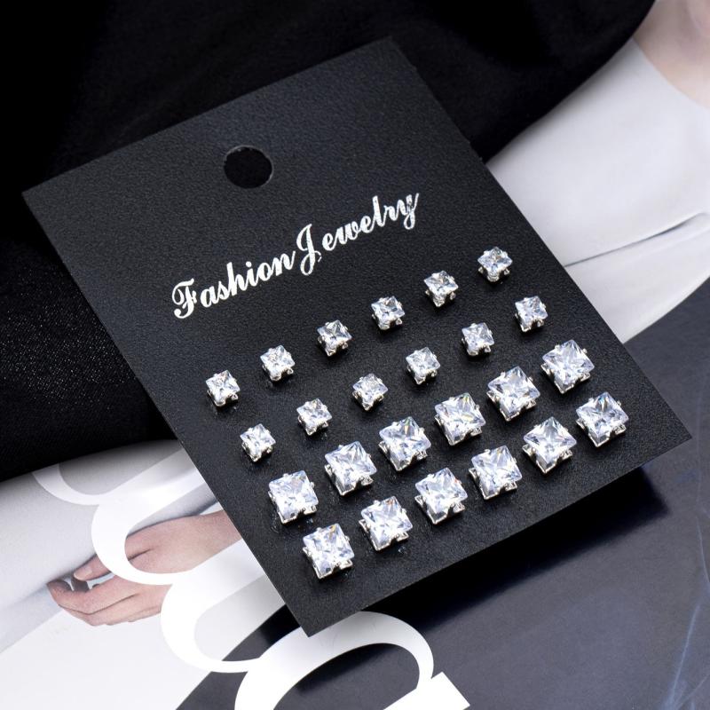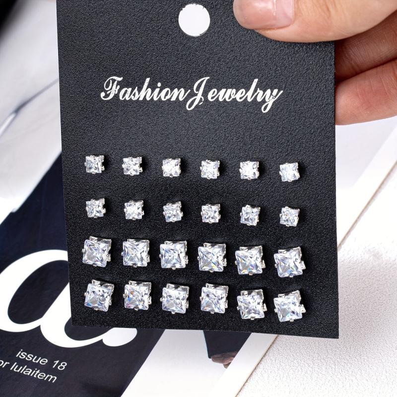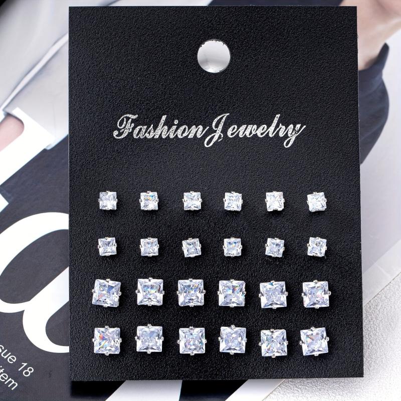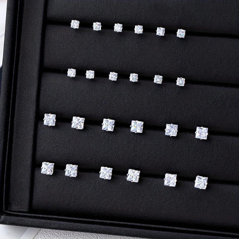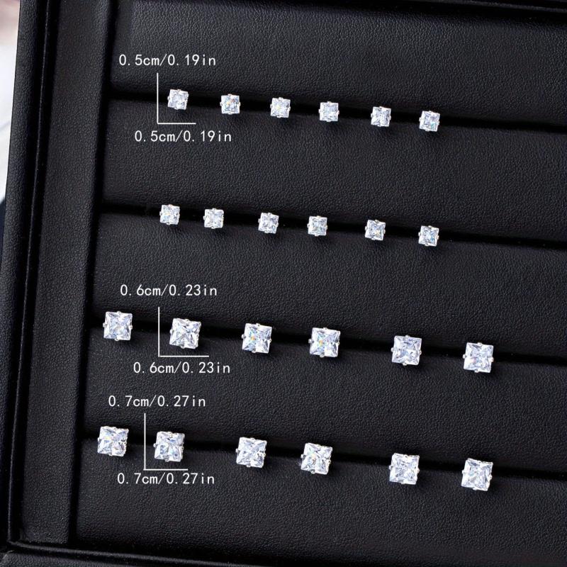 This set includes 12 pairs of square cubic zirconia stud earrings, perfect for daily wear and gift giving. Made of stainless steel and alloy, these earrings are durable and stylish.
