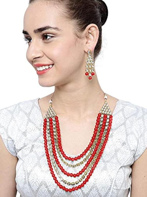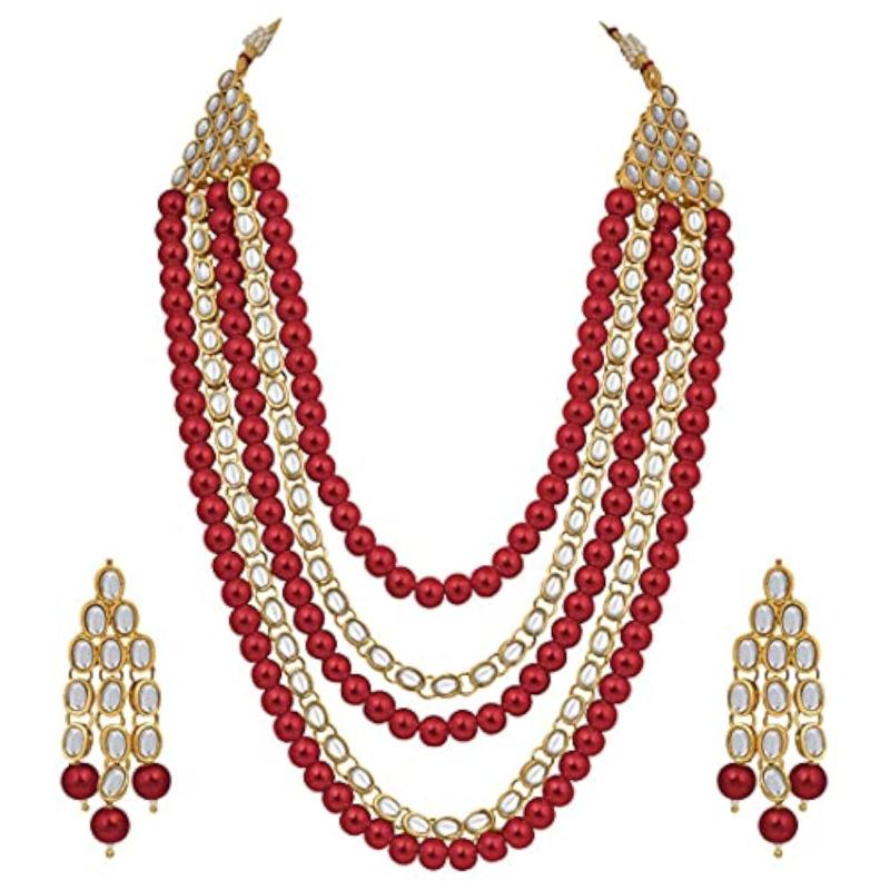 Elegant 18K plated necklace set with Kundan and pearl beads for a luxurious look.