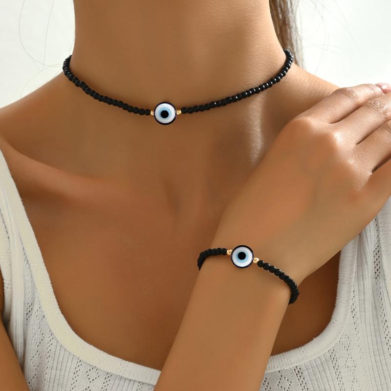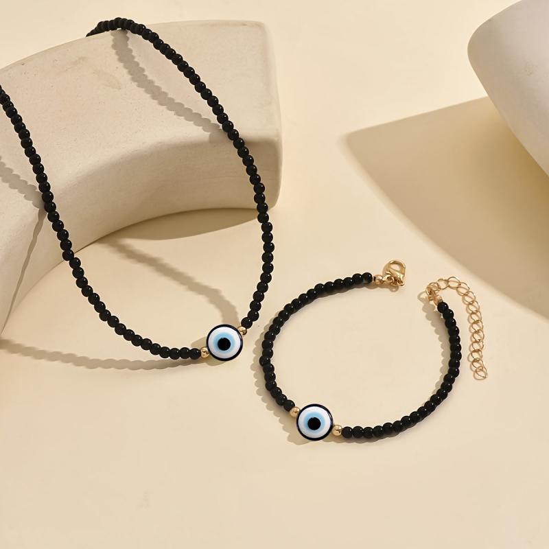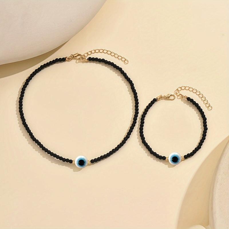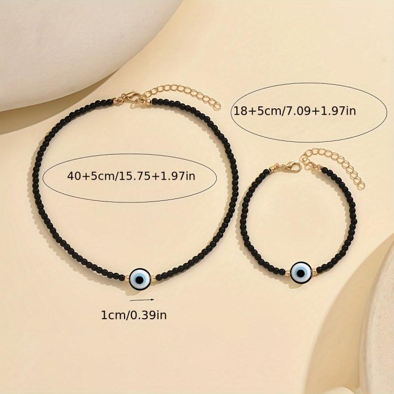 Elegant and chic turquoise eye beaded jewelry set. Embrace retro style with a touch of minimalism.
