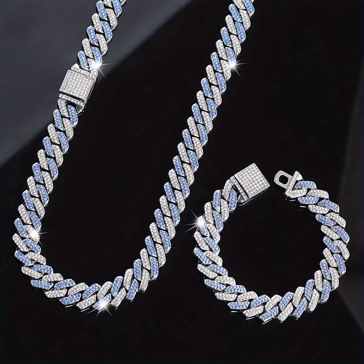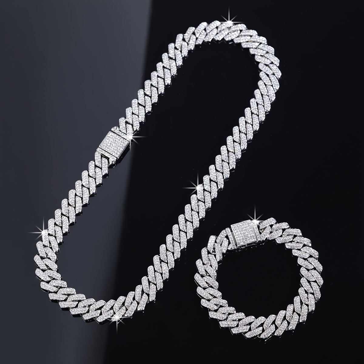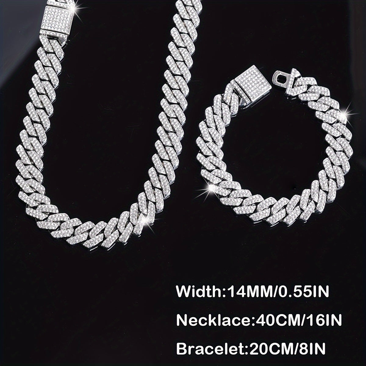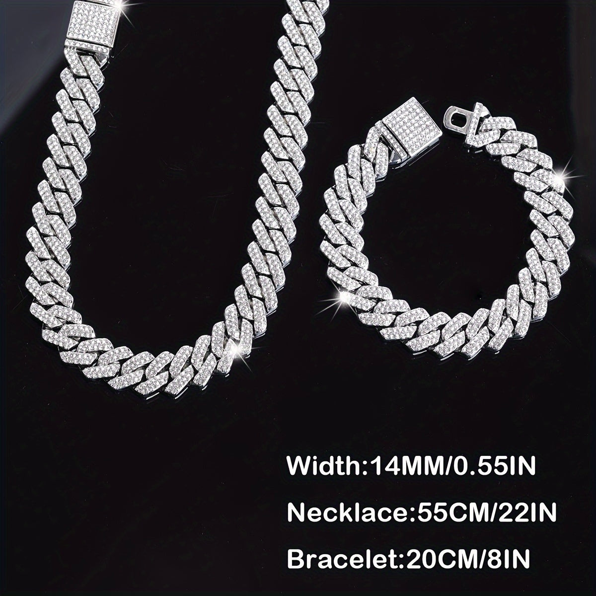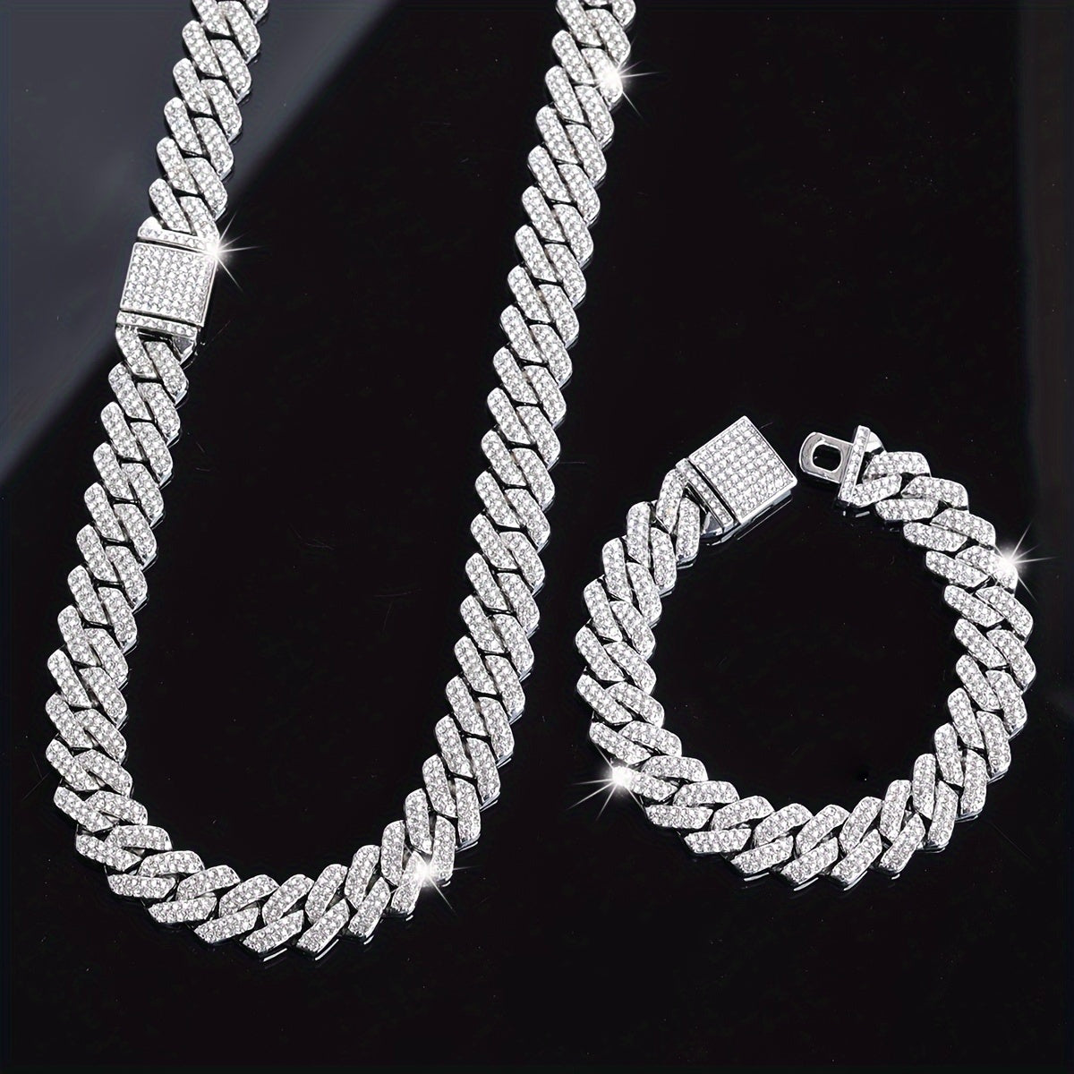 This stylish jewelry set includes a silvery plated necklace and bracelet featuring rhinestone accents. Perfect accessory for friends who love punk and hip hop fashion.