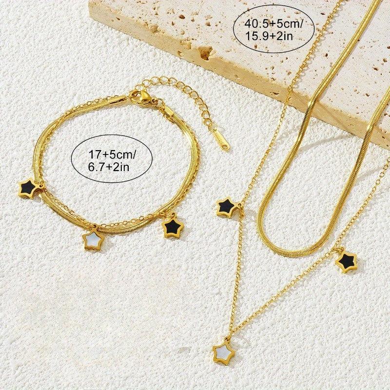 Elegant stainless steel star necklace and bracelet set perfect for special occasions or as a gift. Features high-quality 18K gold plating and hypoallergenic material.