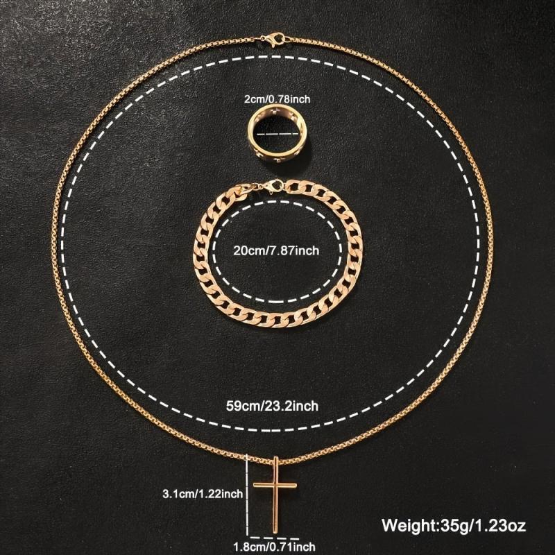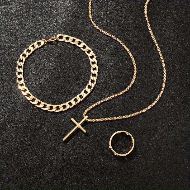 Surprise her with this stylish cross jewelry set, including a necklace, ring, and bracelet. Perfect for Christmas gift giving!