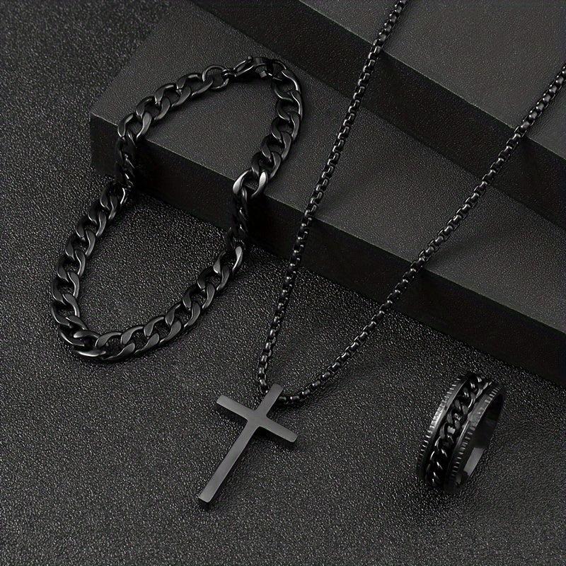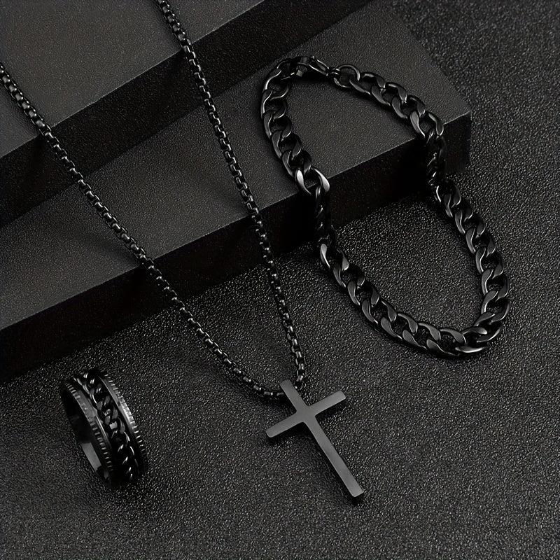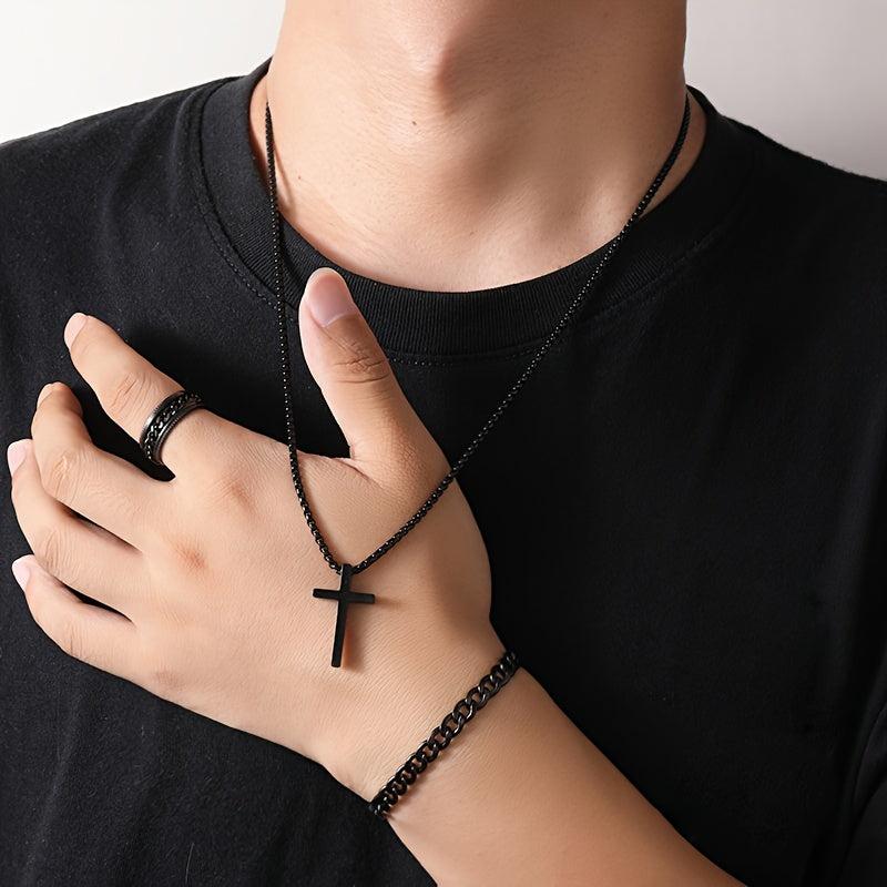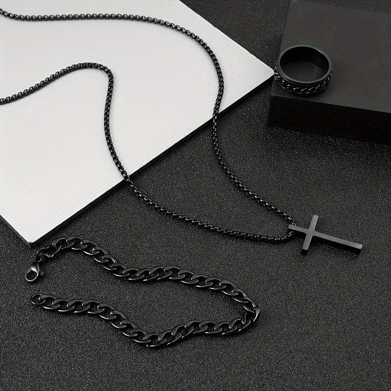 Elevate your style with this versatile set of stainless steel cross jewelry featuring a stylish dark design.