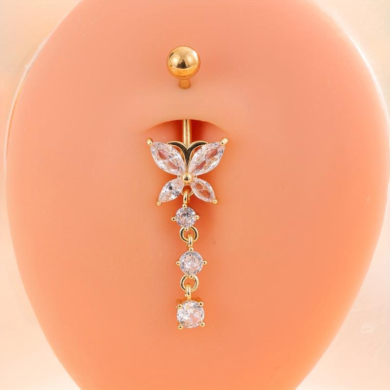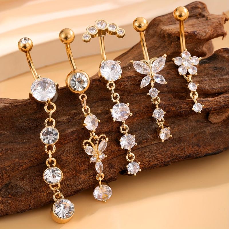 This set includes 5 belly button rings made of stainless steel with CZ inlay featuring butterfly and floral designs. Perfect for adding some glamour to your belly button piercing.