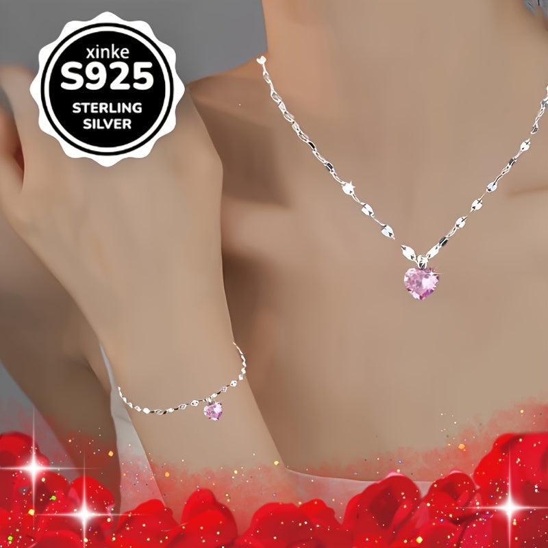 This set includes a stylish pendant necklace and bracelet crafted from 925 sterling silver with a lip-shaped design and pink synthetic zirconia heart. It's a perfect accessory for parties and an ideal gift for mother's day or any special occasion.