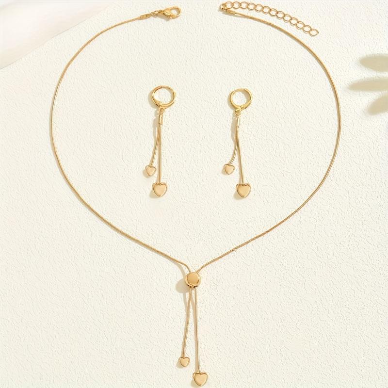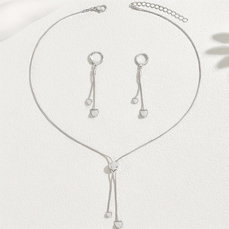 This set includes a snake bone thin chain necklace with heart-shaped pendant and heart drop earrings. Perfect for daily wear.