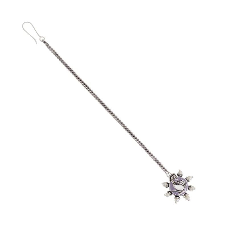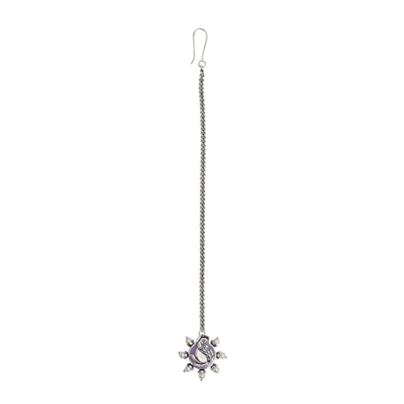 This elegant Apsara maang tika features faux pearls and a peacock motif. Perfect for special occasions.