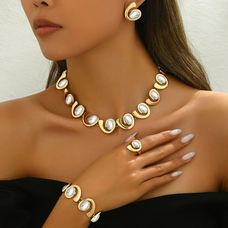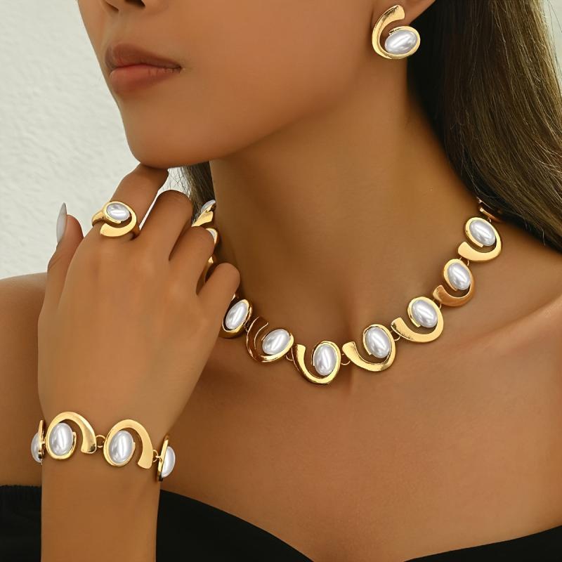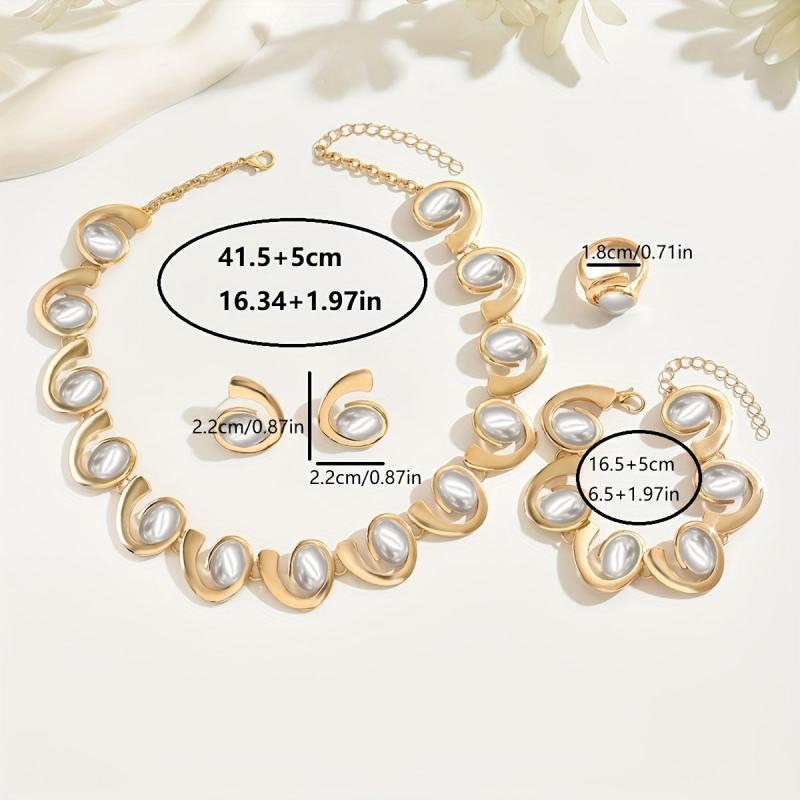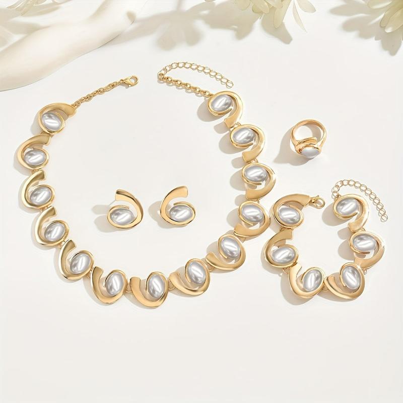 Complete your look with this stunning jewelry set featuring a necklace, bracelet, and earrings in a spiral snail roll shape design with inlaid artificial pearls.