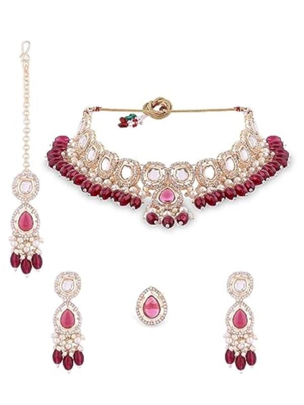 Elegant choker necklace set with artificial stone beads, perfect for women. Includes earrings, maangtikka, and ring.