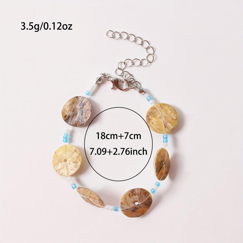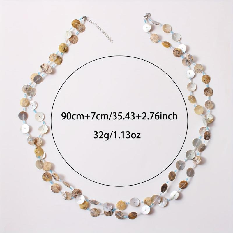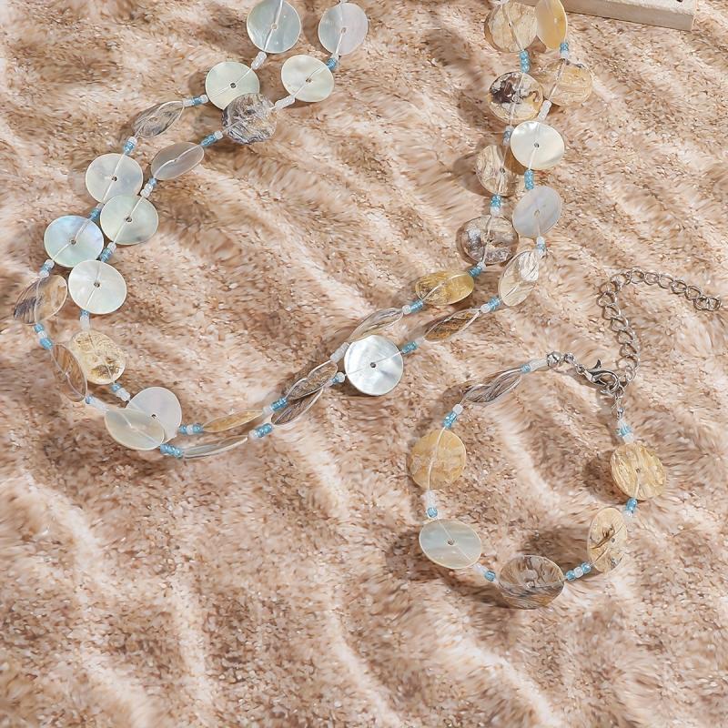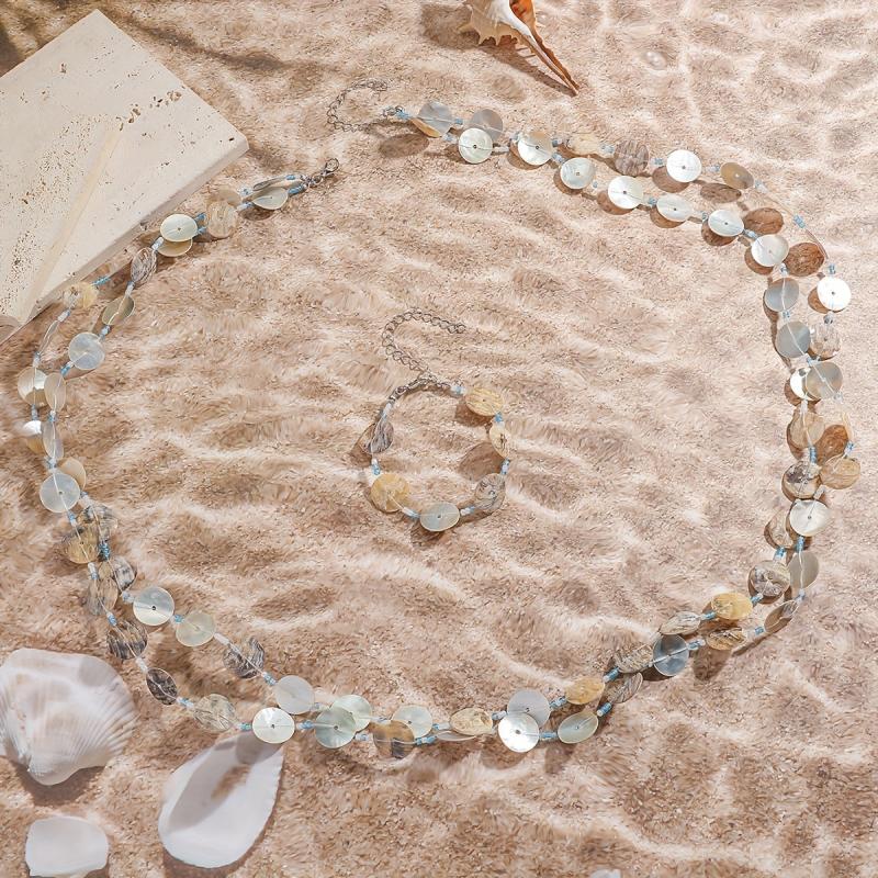 Elevate your beach look with this long shell necklace and bracelet set. The versatile shell jewelry set features random bead colors for a unique touch.