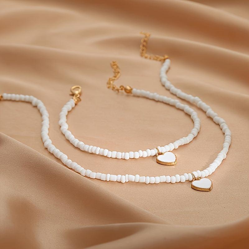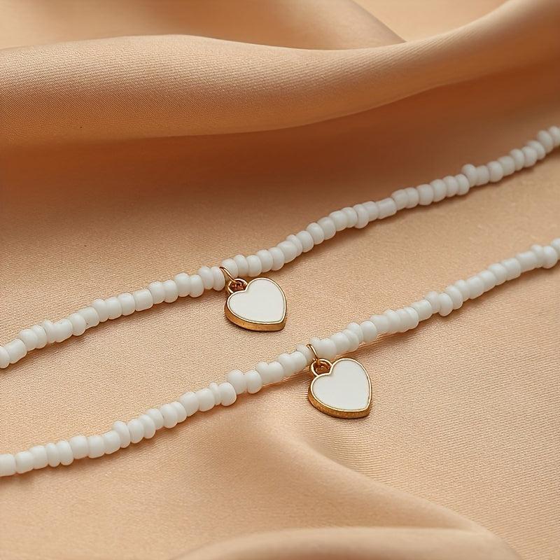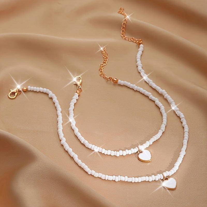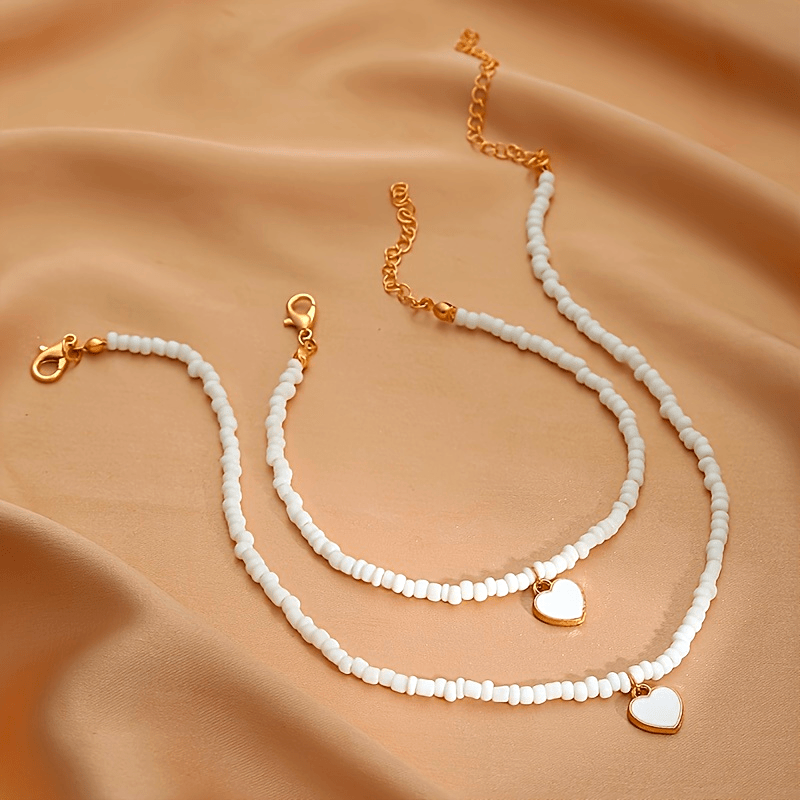 Adorn yourself with this lovely two-piece set featuring a heart pendant necklace and bracelet made of colorful beads.