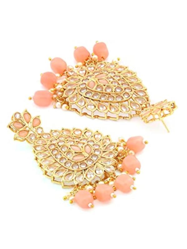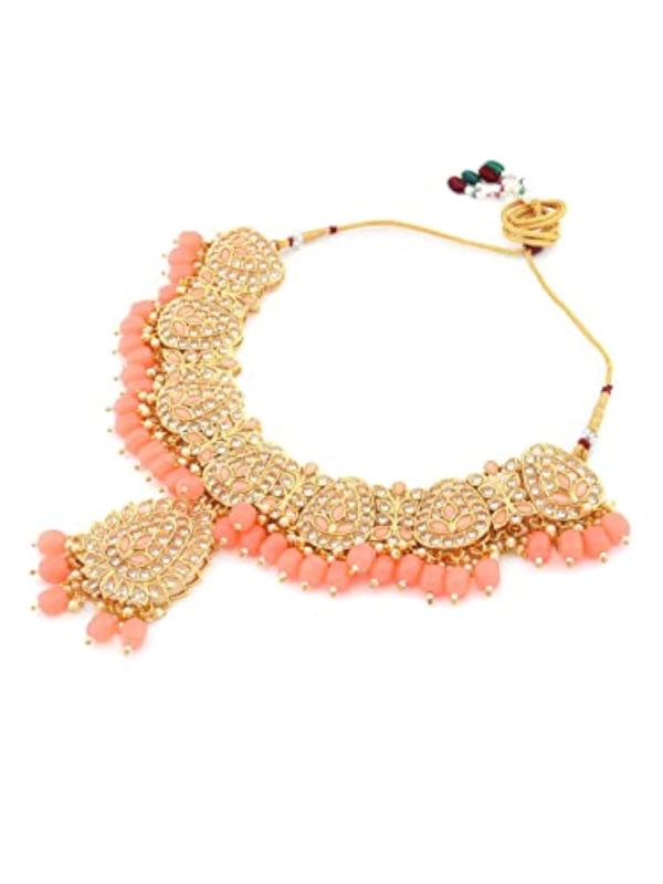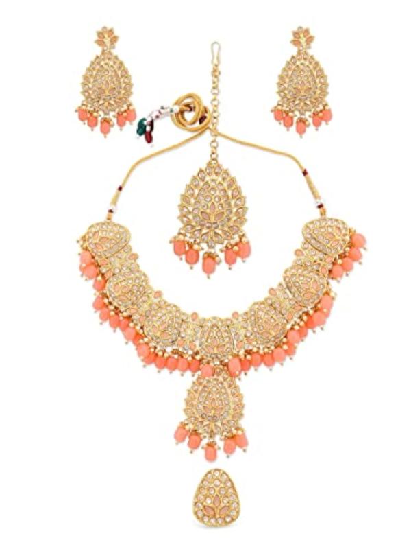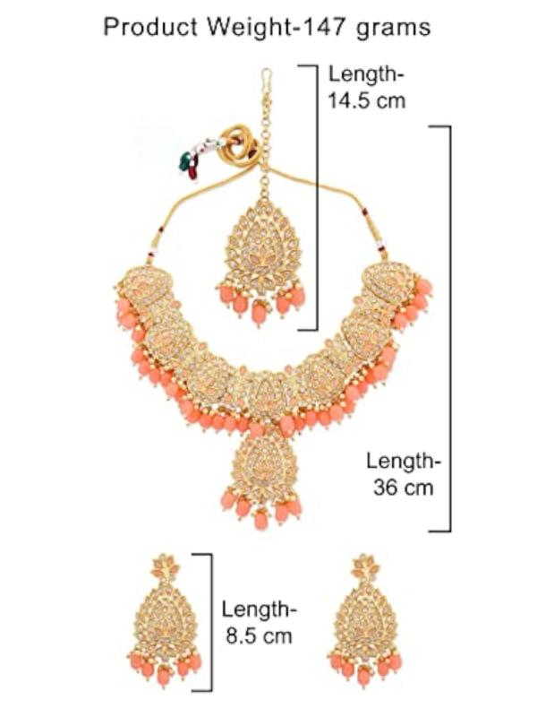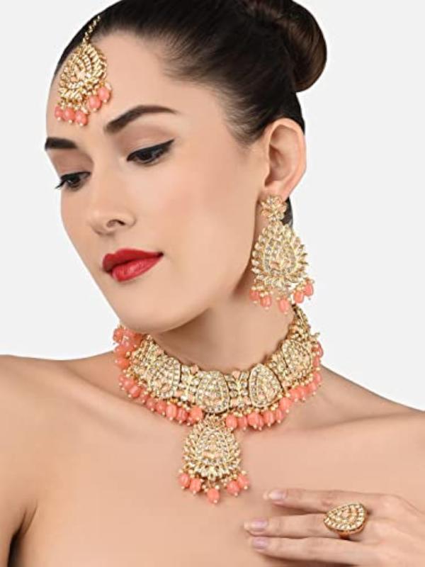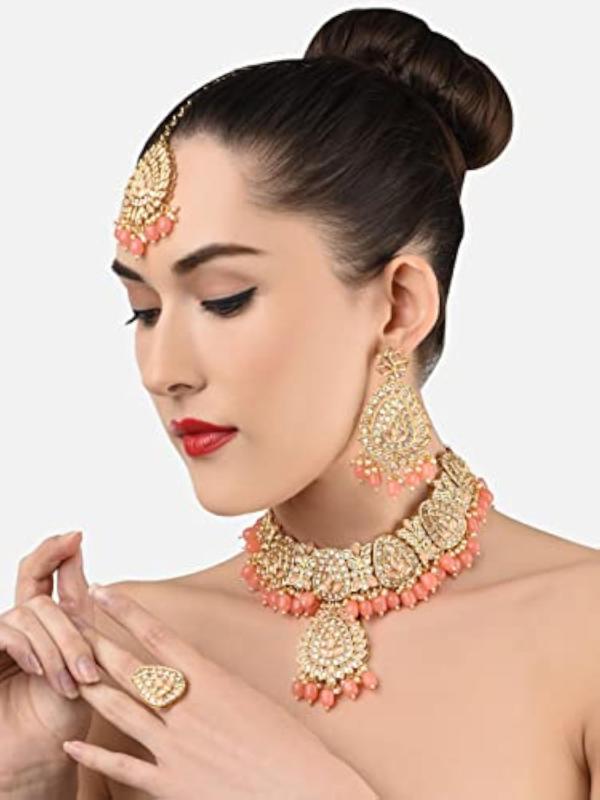 Enhance your ethnic look with this exquisite set. It includes a choker necklace, earrings, a maangtikka, and a ring. Perfect for weddings or special occasions.