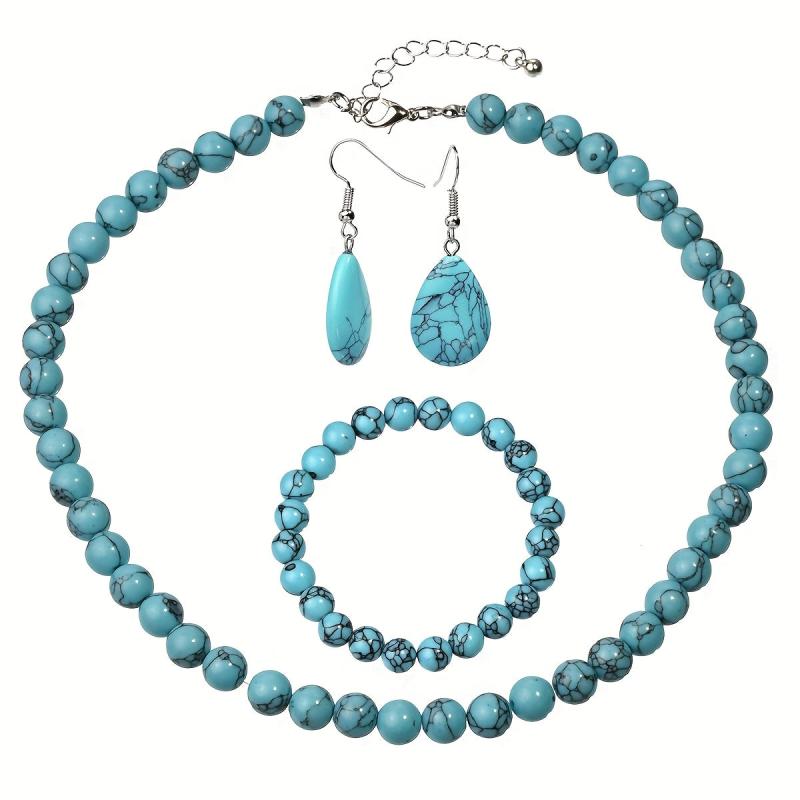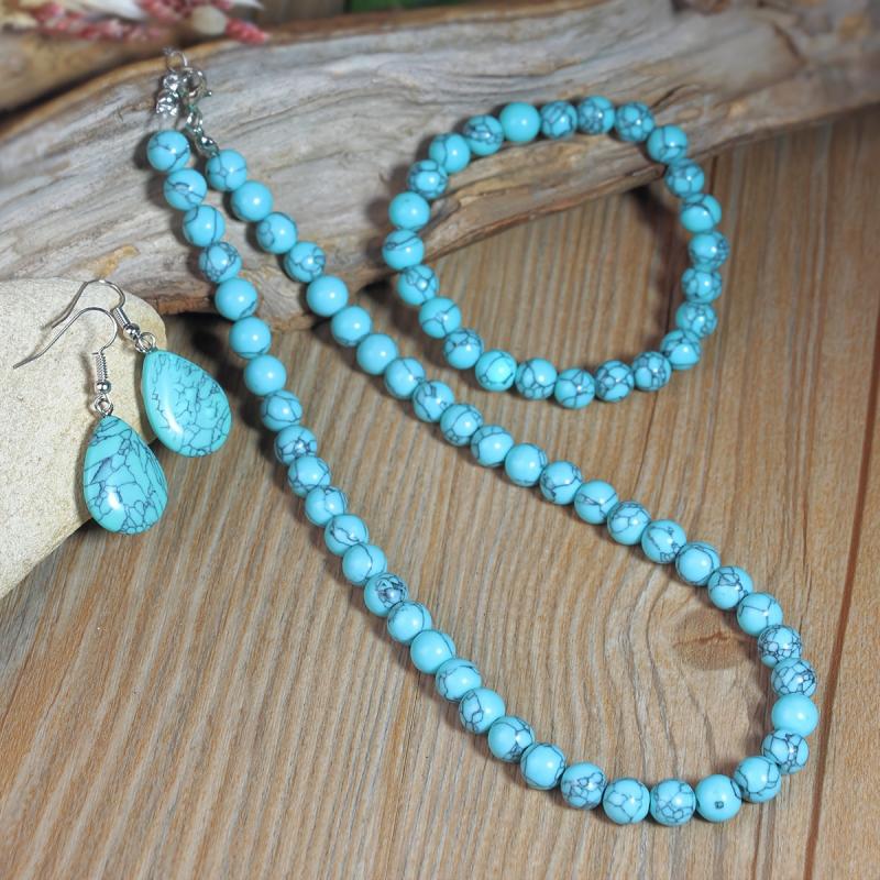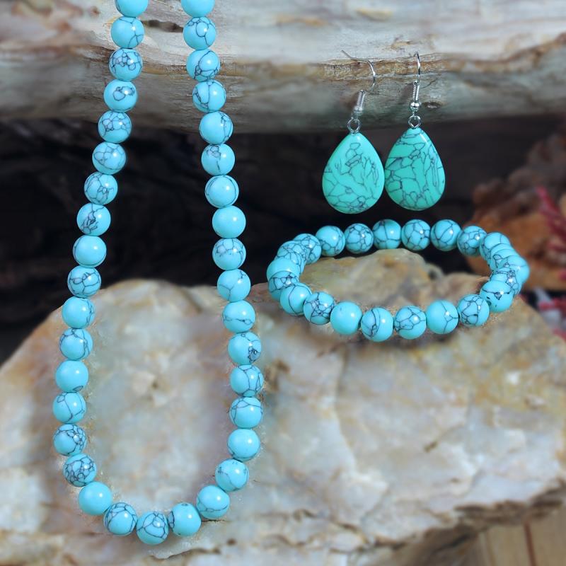 This set includes a synthetic turquoise necklace, bracelet, and earrings, making it a perfect bohemian jewelry gift. The set comes with random natural stone colors.