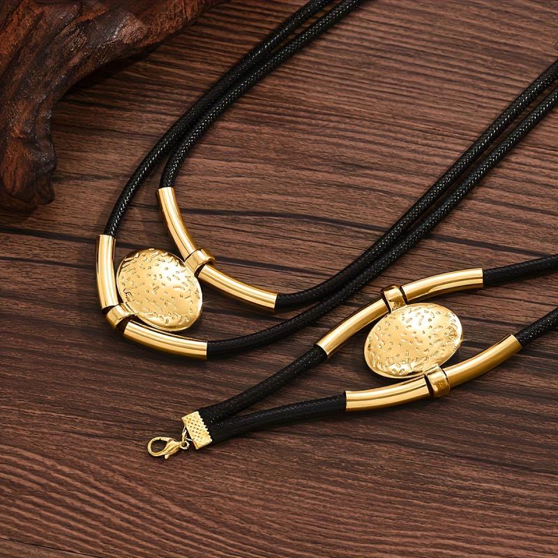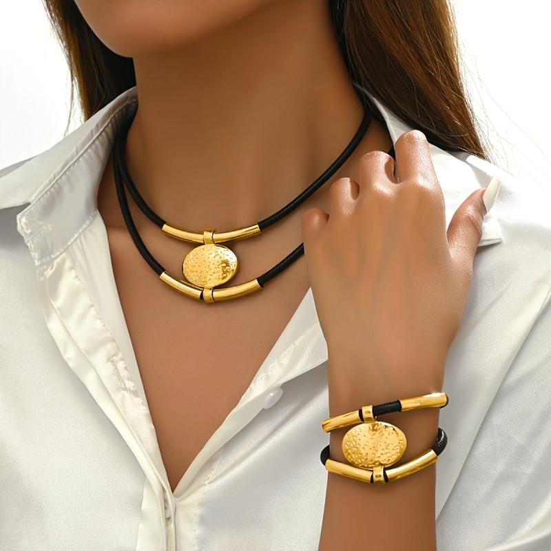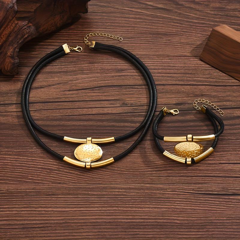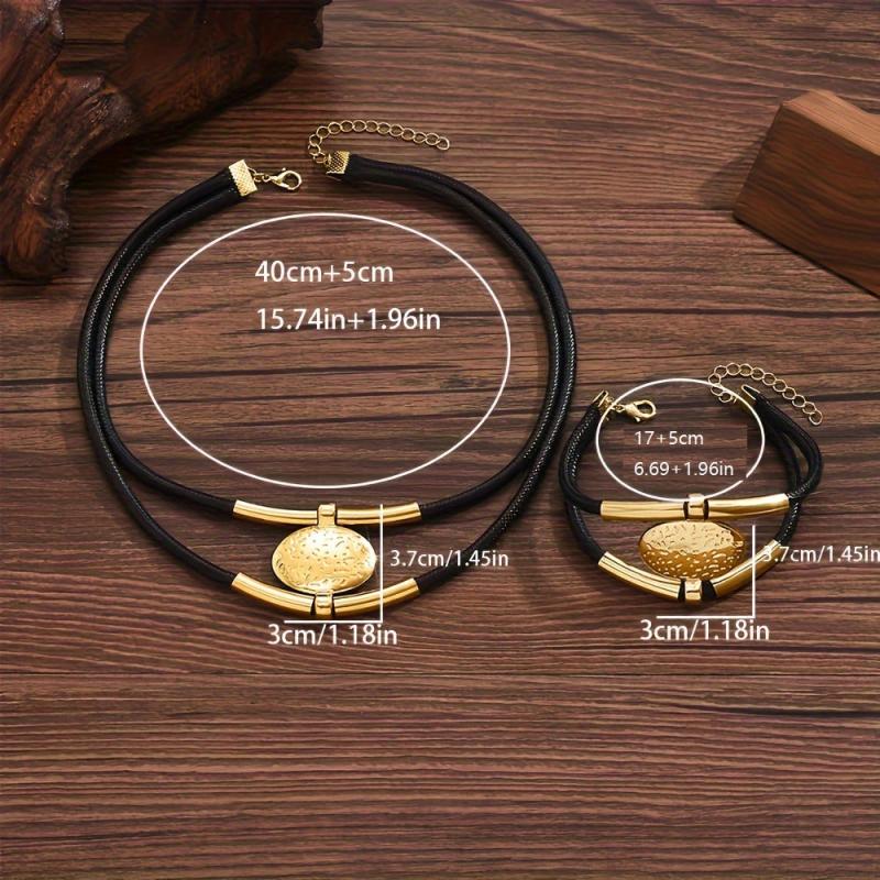 This 2-piece vintage style jewelry set includes an alloy circle pendant necklace and bracelet that are versatile for daily wear or party occasions.