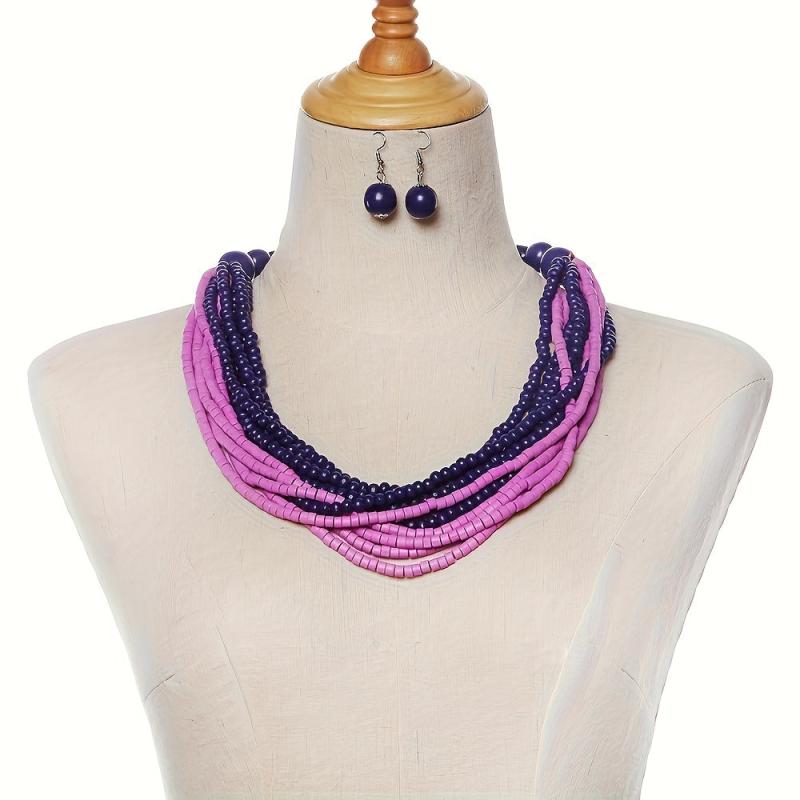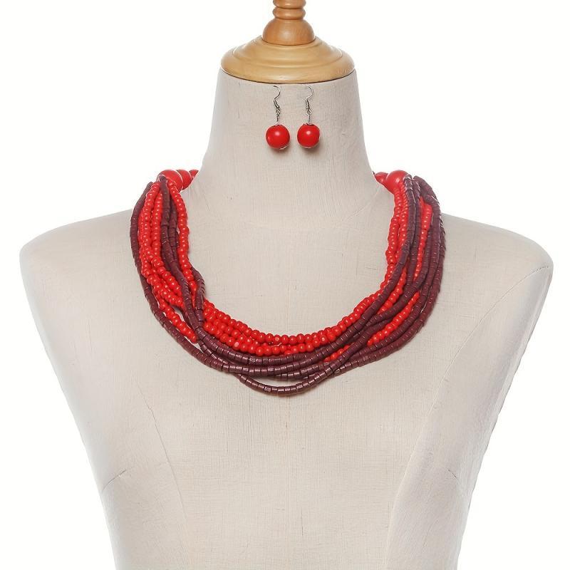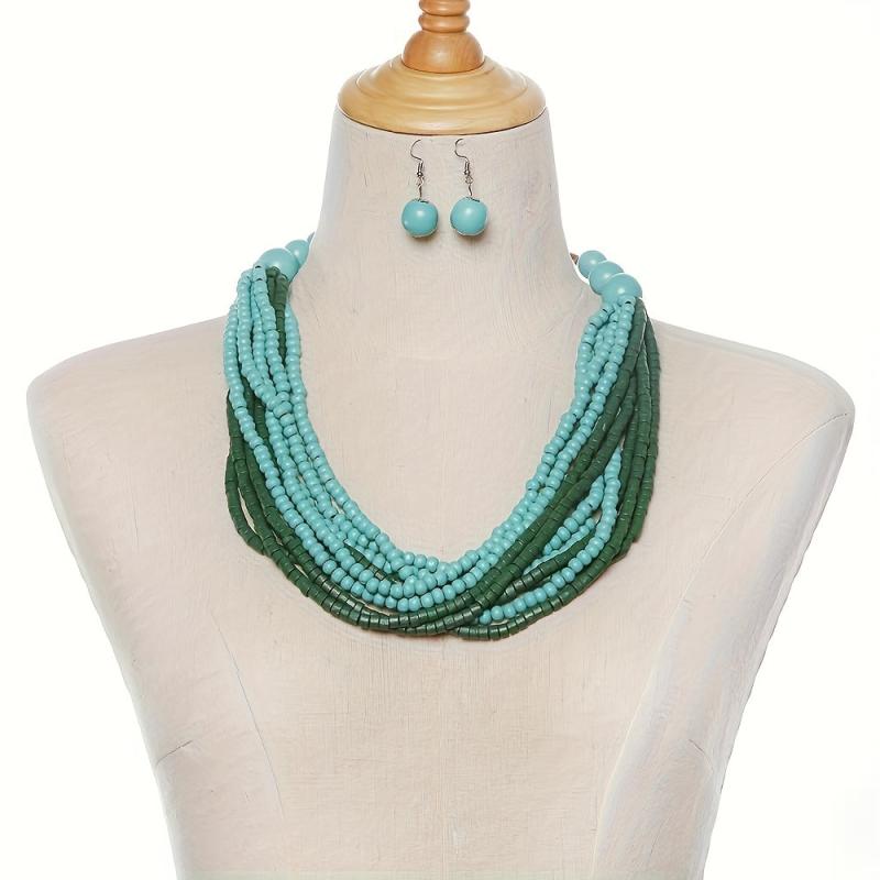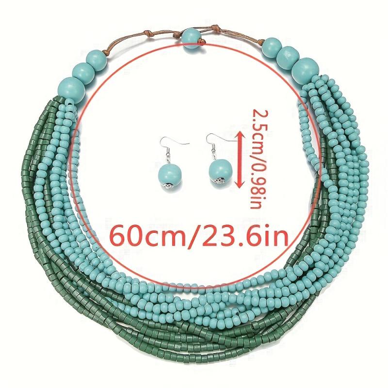 This bohemian style wooden bead jewelry set includes a layered necklace and matching earrings. Perfect for adding a touch of style to your casual or party wear outfits.