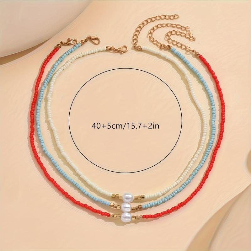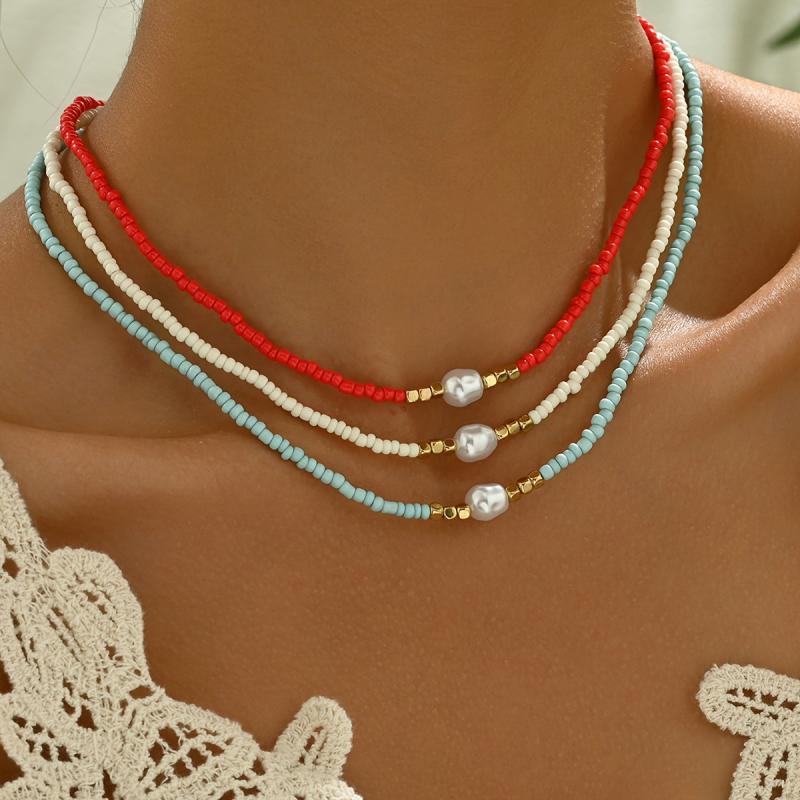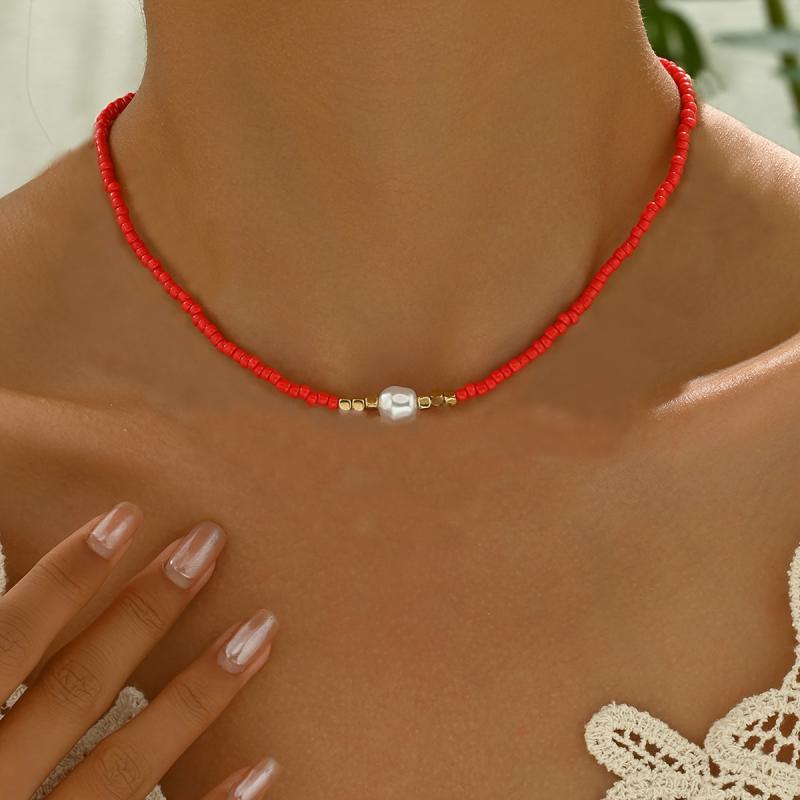 Add a pop of color to your beach look with this red rice bead necklace and anklet set. Perfect for a bohemian vibe at the resort.