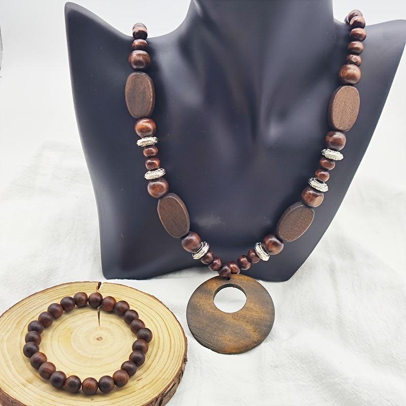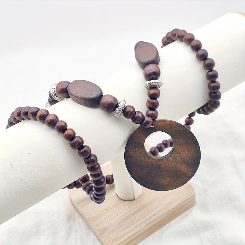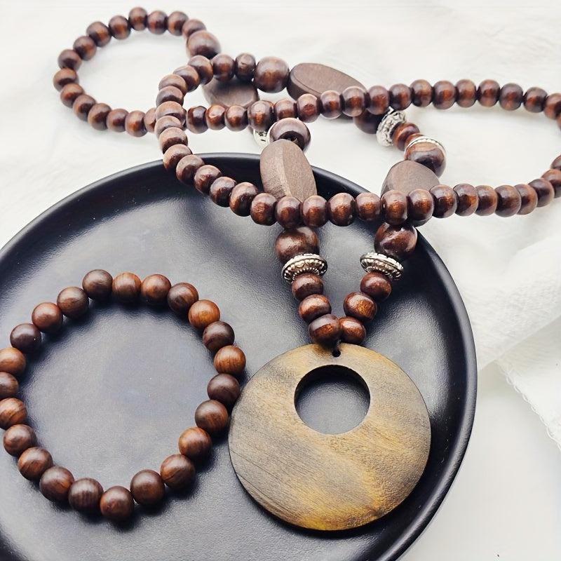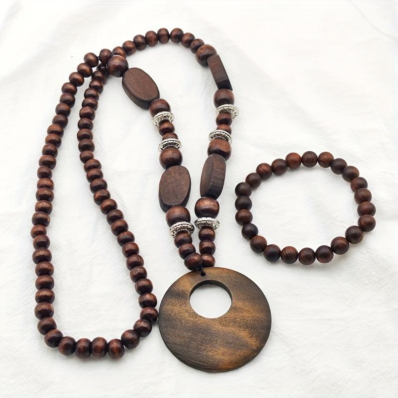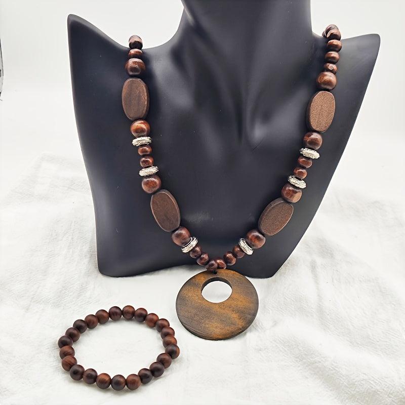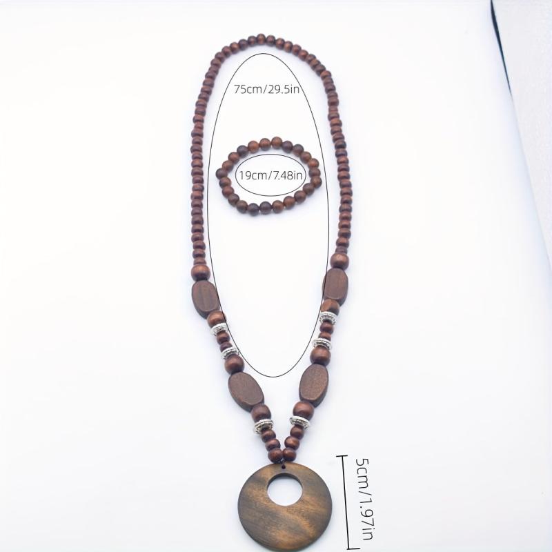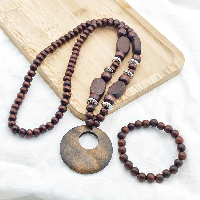 This 2 piece set features a long, natural wood necklace with no plating and a stretch bracelet. The ethnic vintage design exudes a bohemian vibe perfect for a casual yet stylish look.