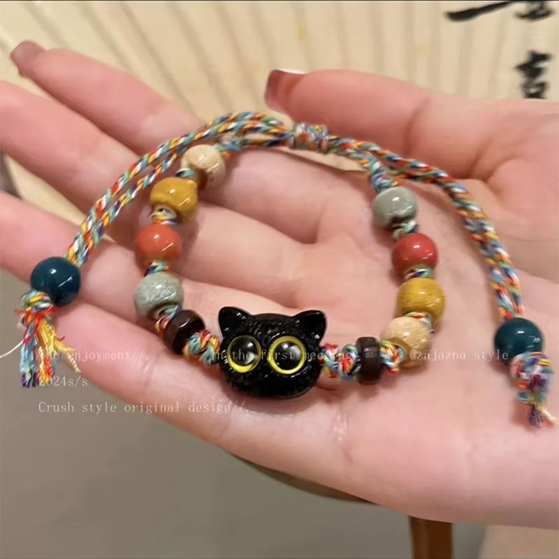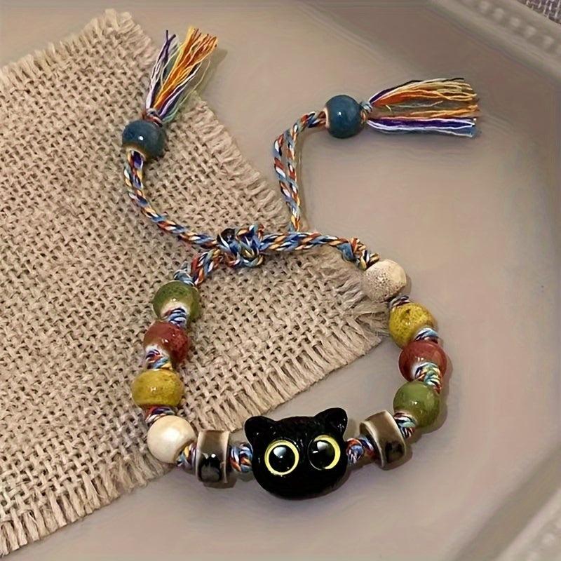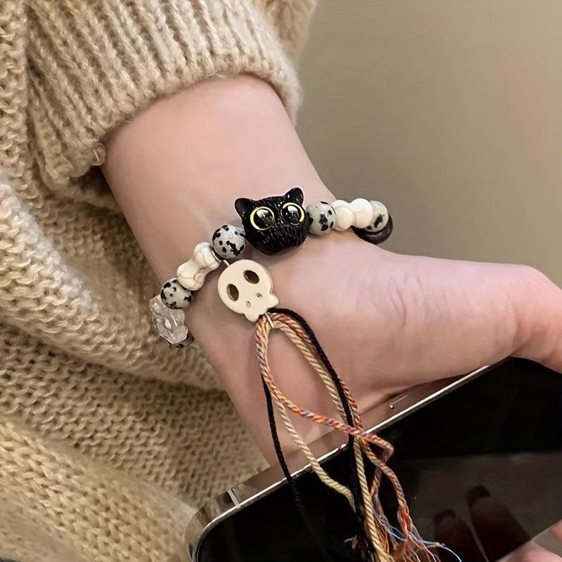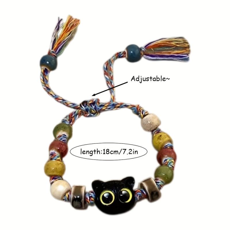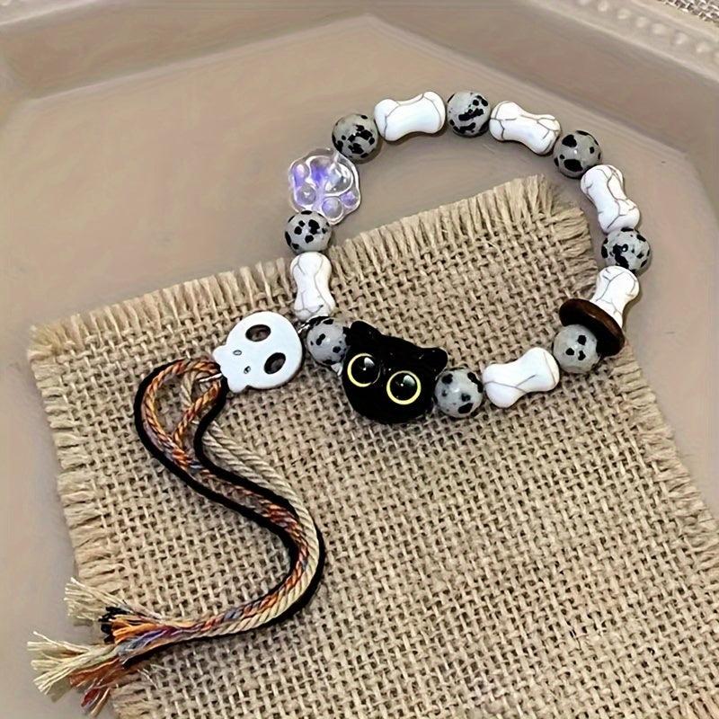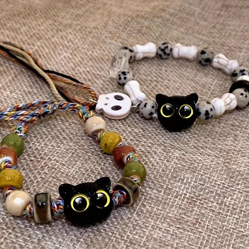 Embrace a vintage & gothic style with this ceramic bracelet featuring cat & skull charms. The colorful braided rope adds a festive touch, making it perfect for Halloween or everyday wear.