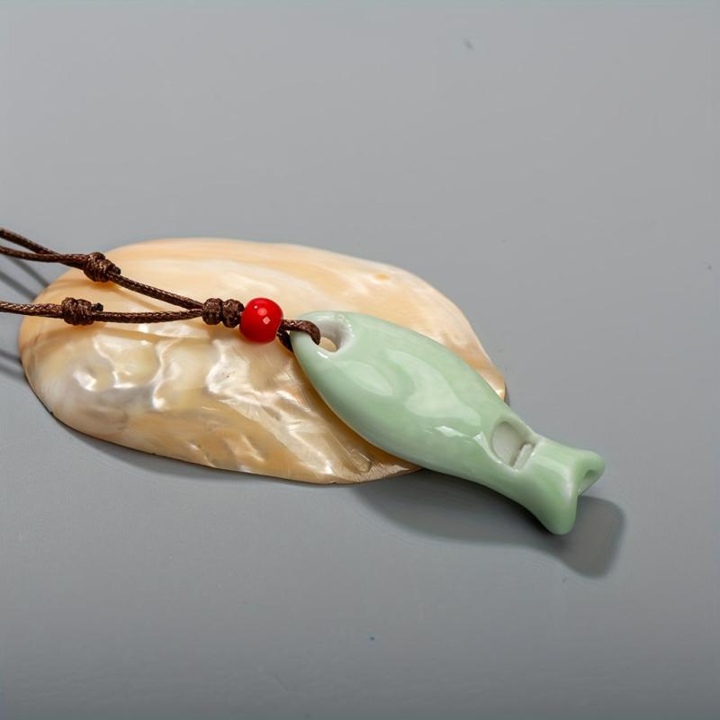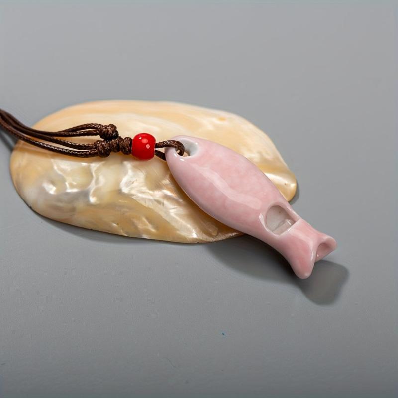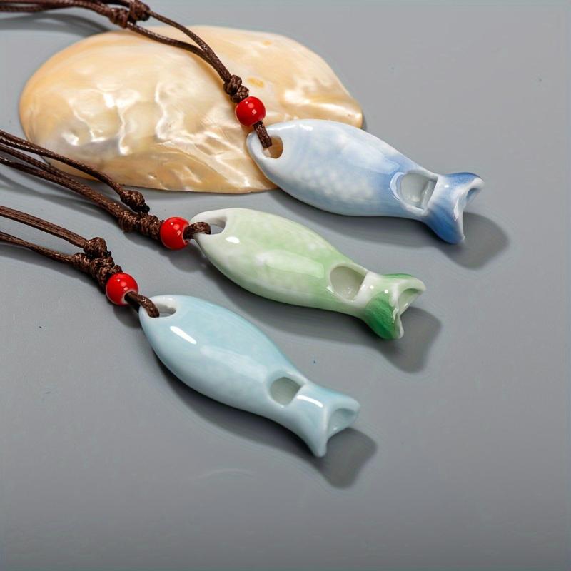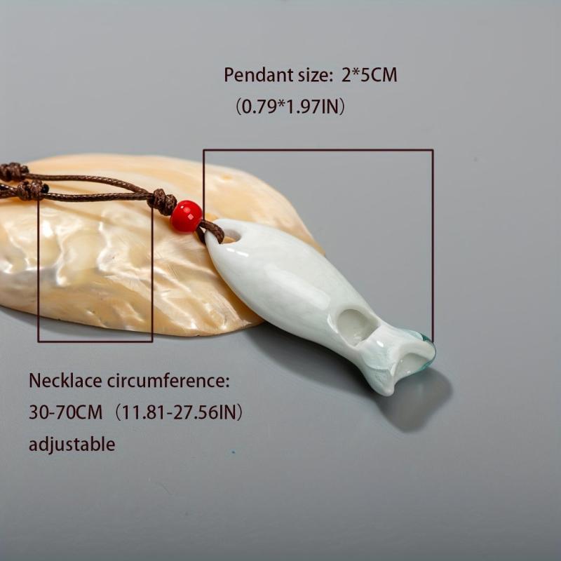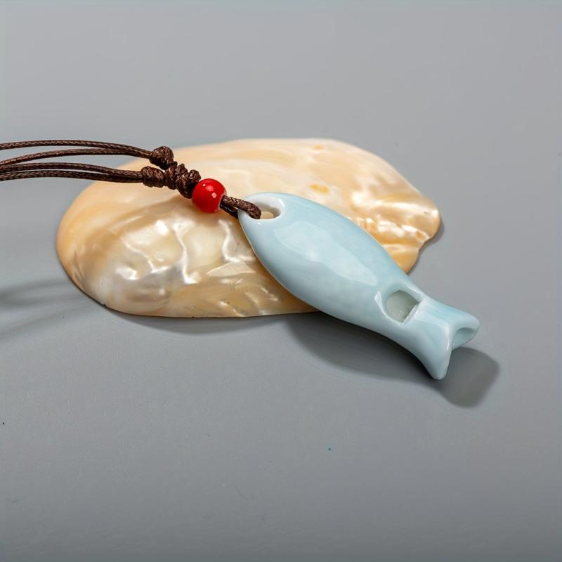 Handcrafted ceramic fish pendant necklace featuring a built-in whistle, inspired by the ocean. Each piece has unique variations and random patterns. Comes with a brown cord, making it suitable for both women and men. Perfect as a gift.