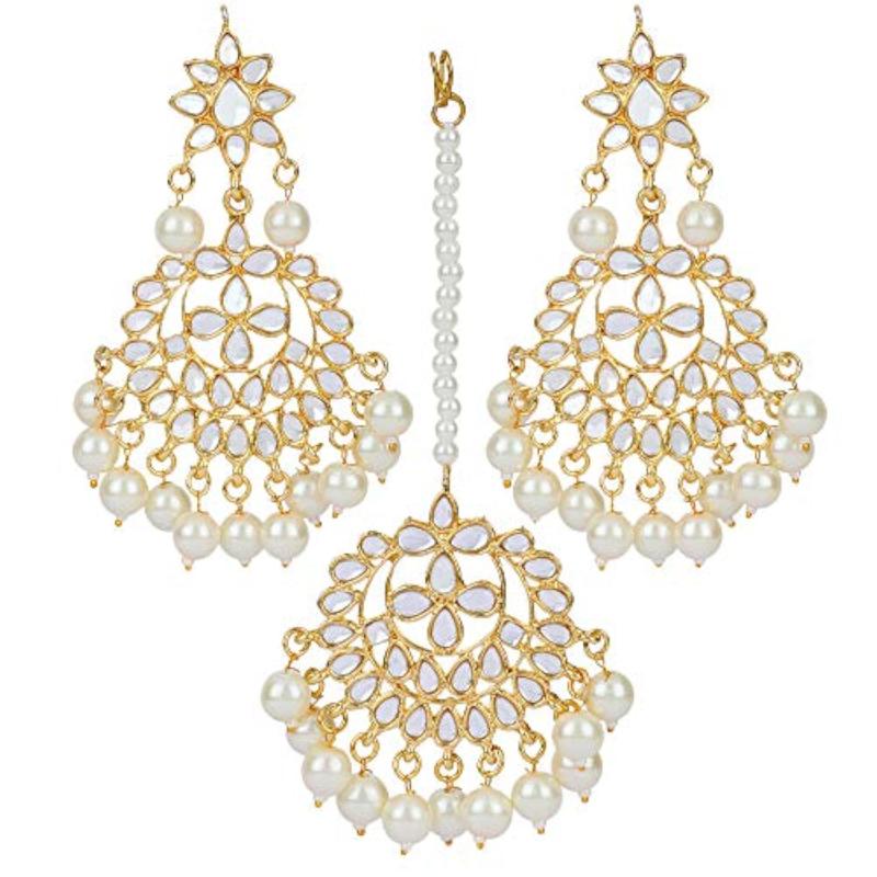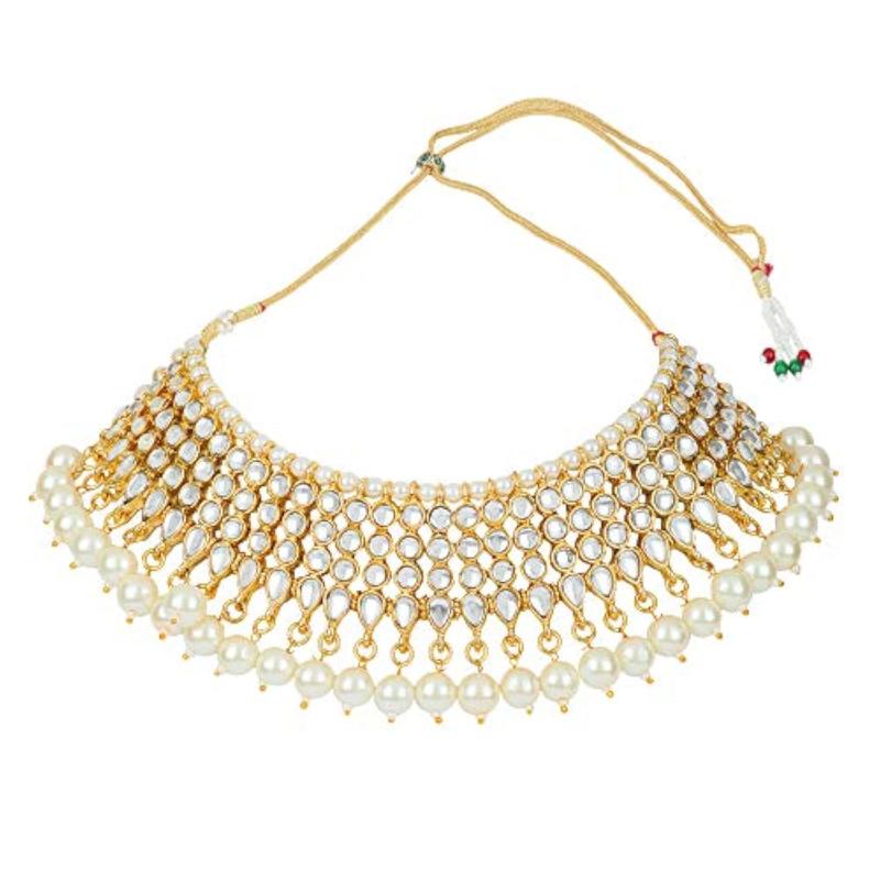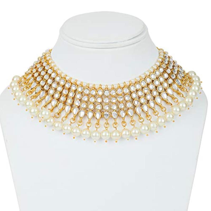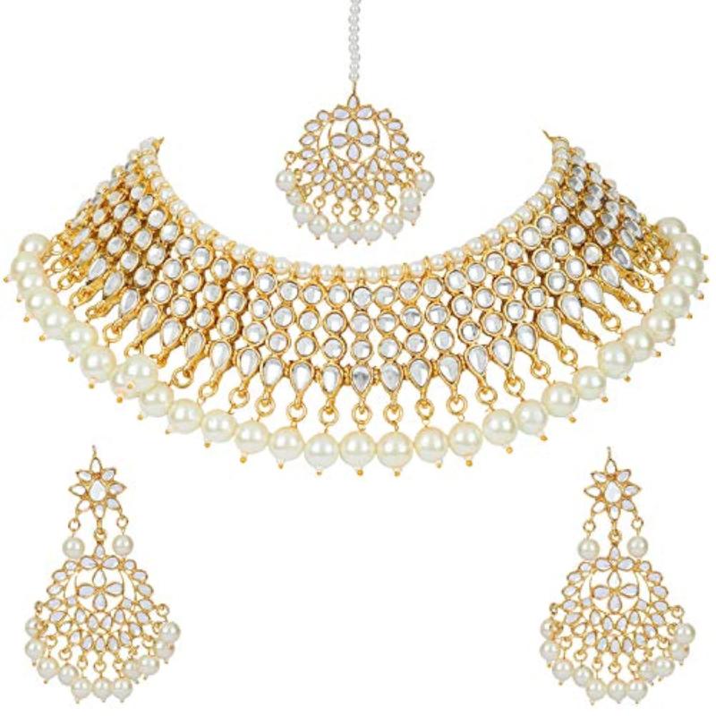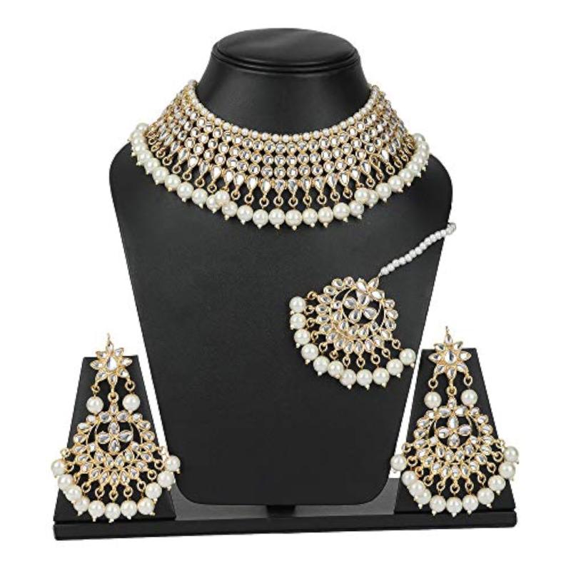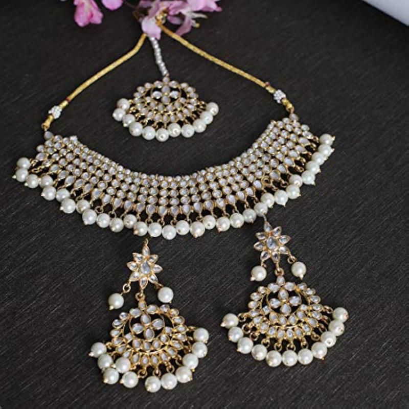 Complete your traditional look with this elegant jewelry set featuring a choker, earrings, maang tikka, and necklace.