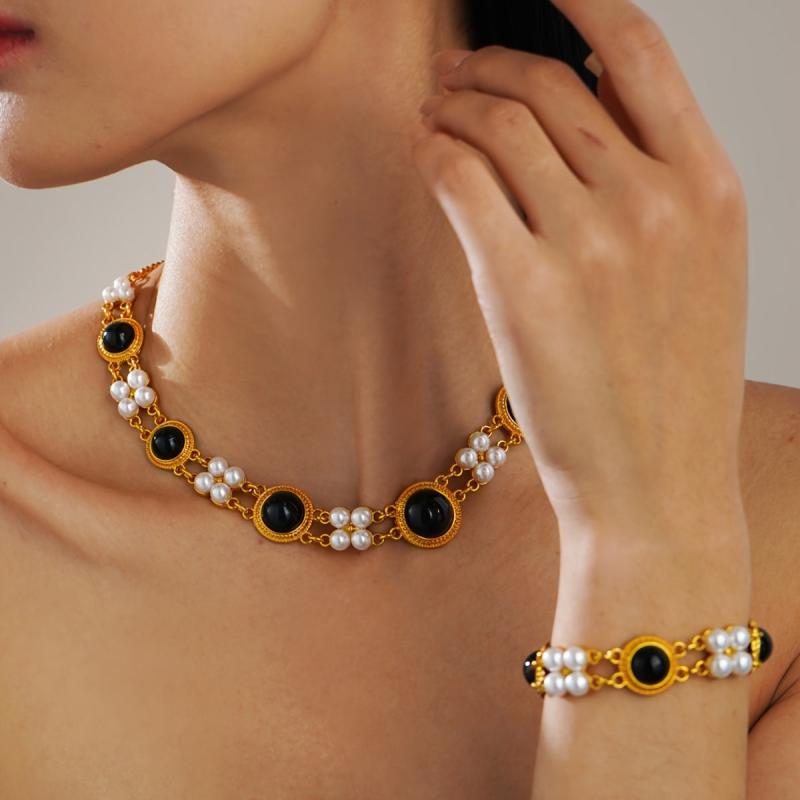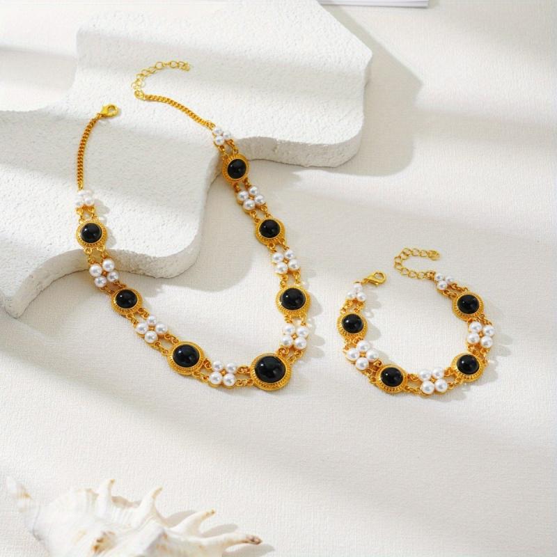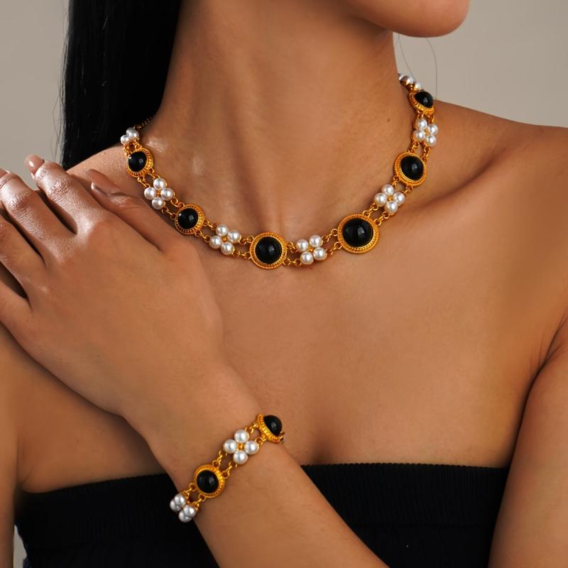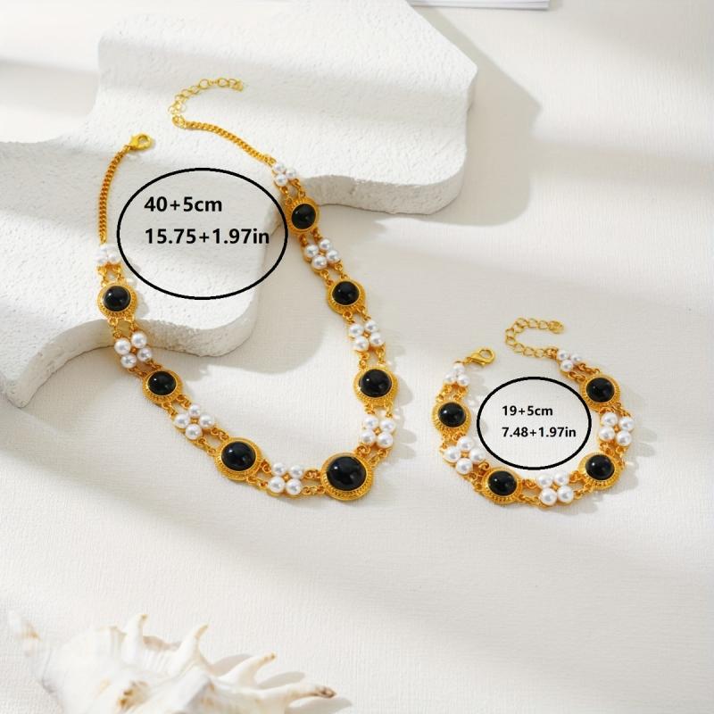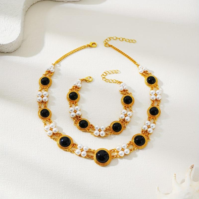 Add elegance to your party outfit with this two-piece set featuring a combination of round stones and artificial pearls in a double layer alternating design.