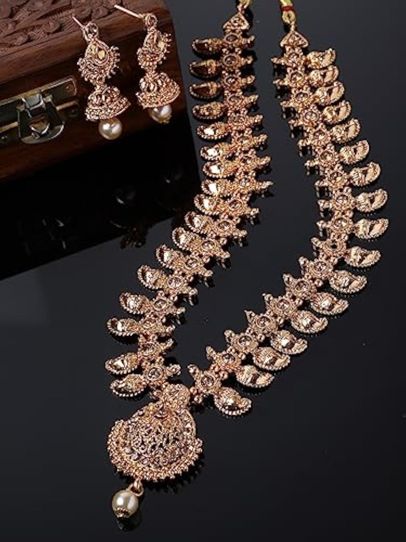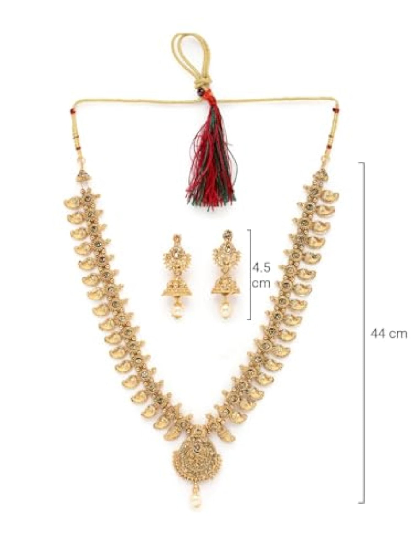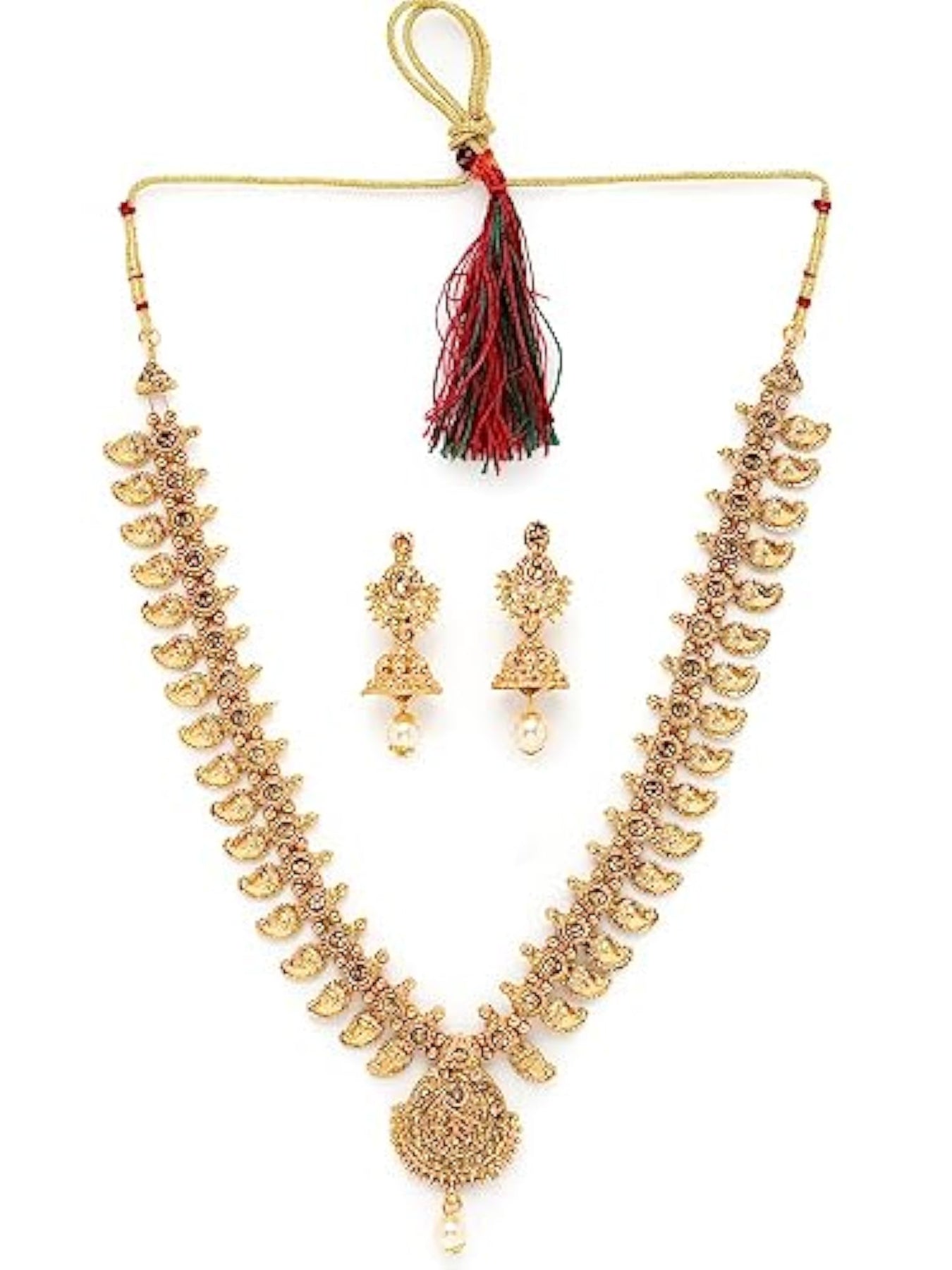 Elegant temple plated copper beads studded long necklace set with stunning jhumke earrings.
