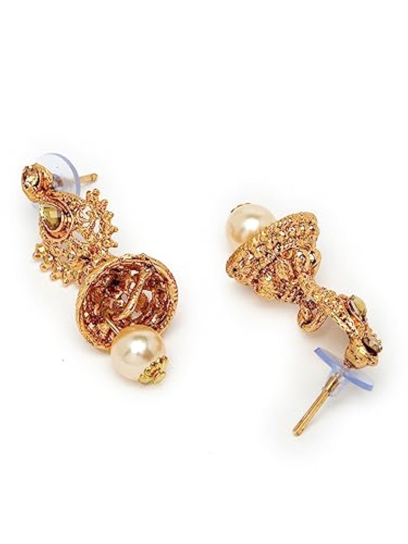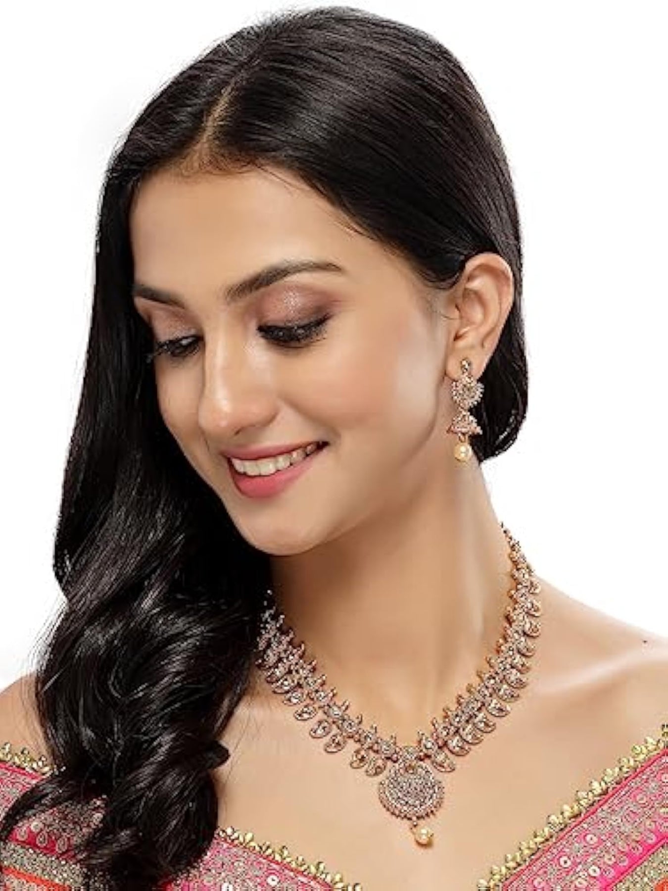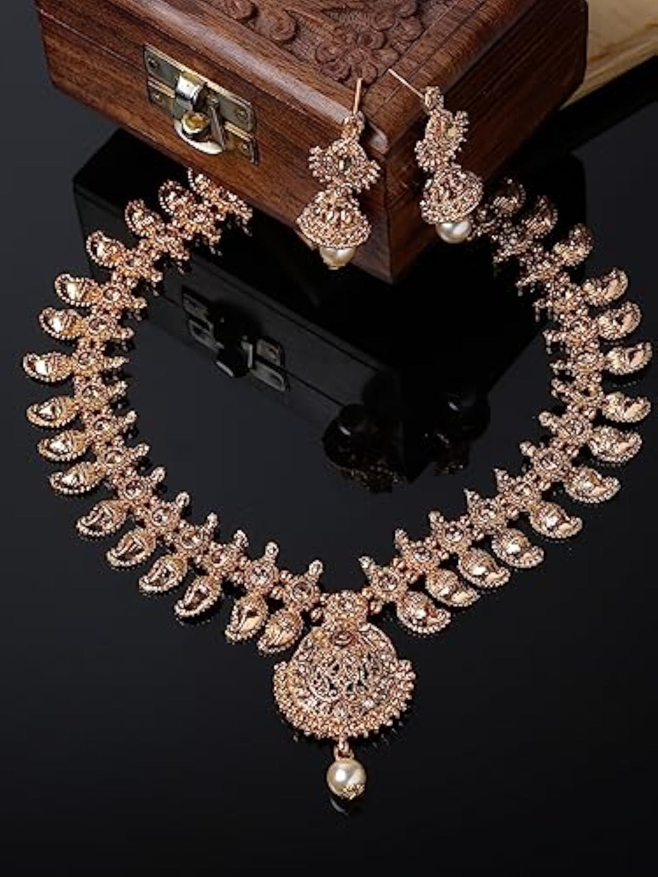 Elegant temple plated copper beads studded long necklace set with stunning jhumke earrings.