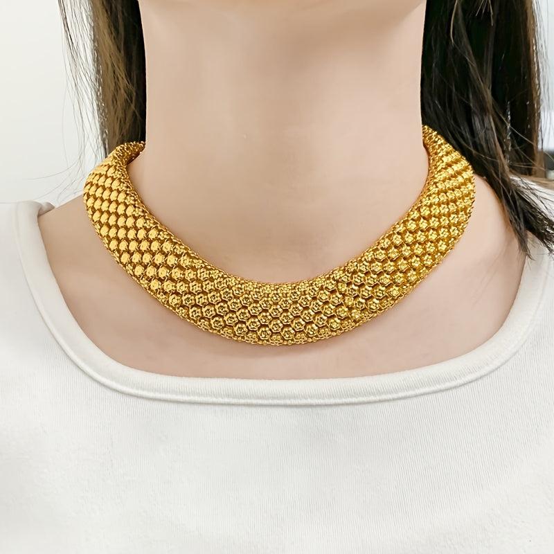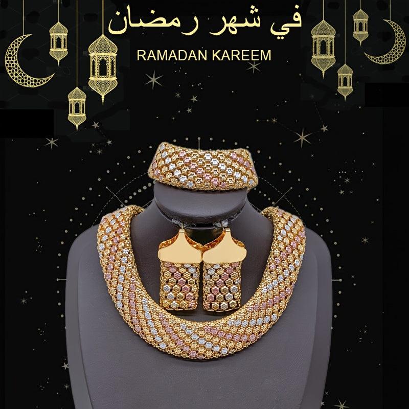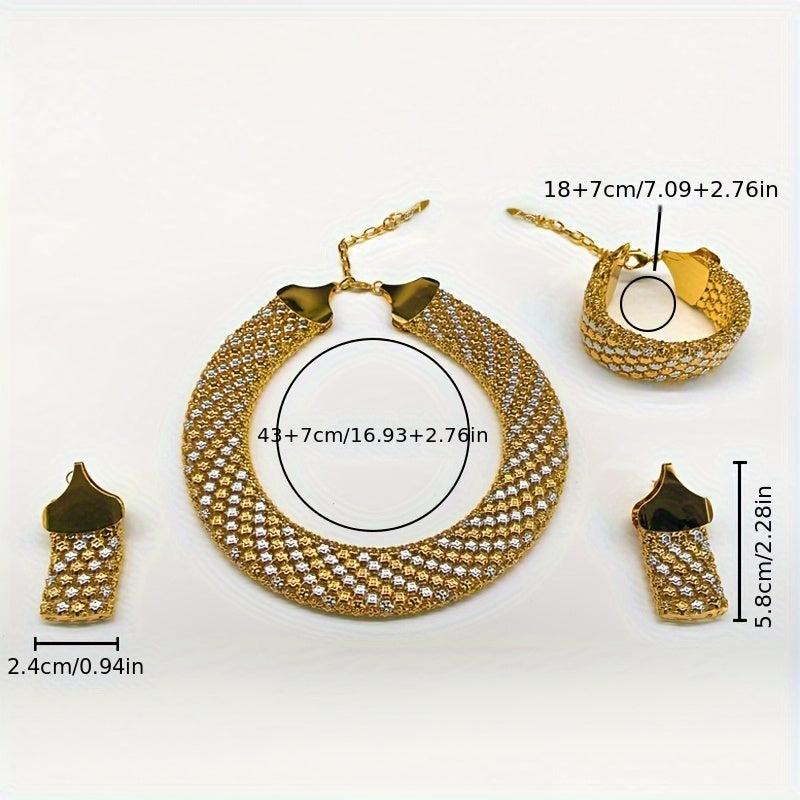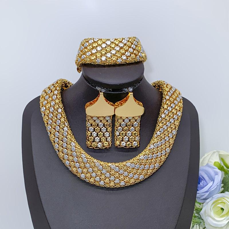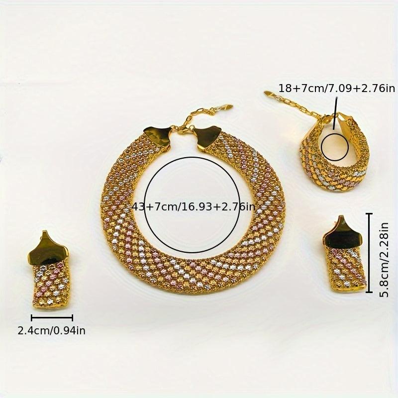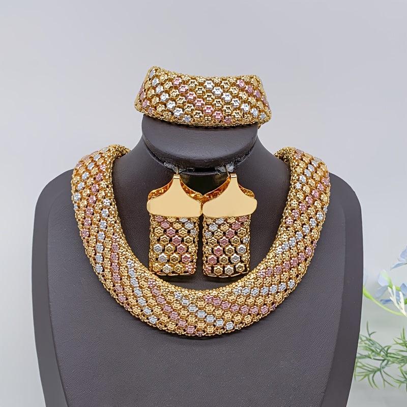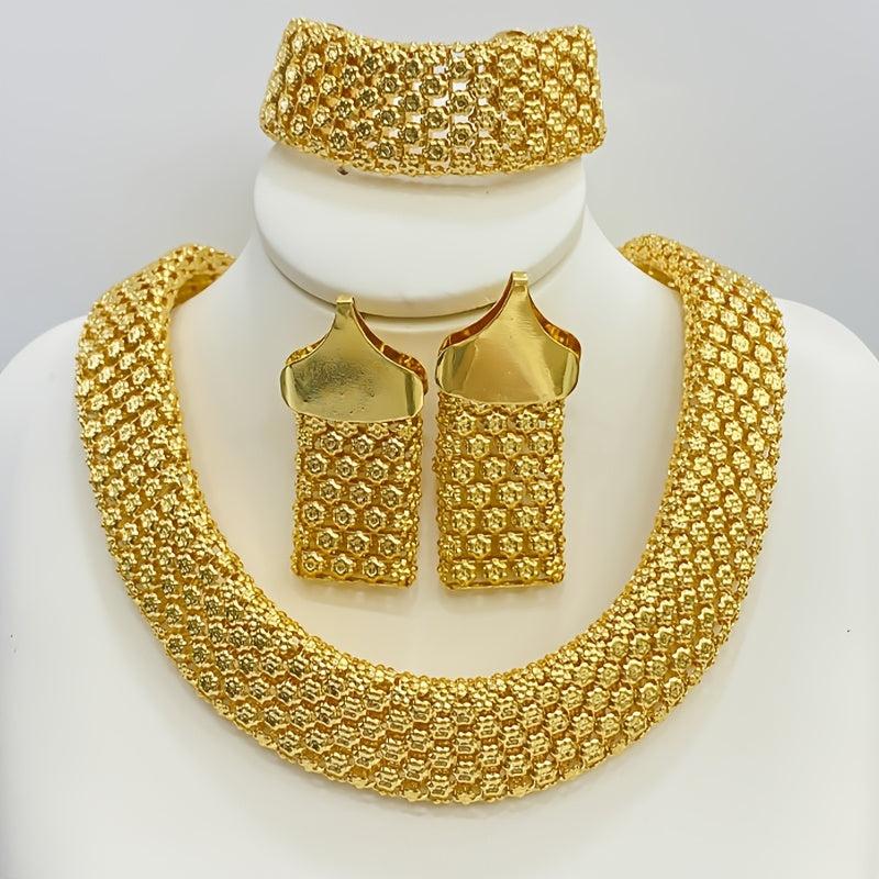 Complete your party look with this stunning bridal jewelry set that includes a pair of colorful or solid earrings, a matching necklace, and a bracelet with bold wide links.