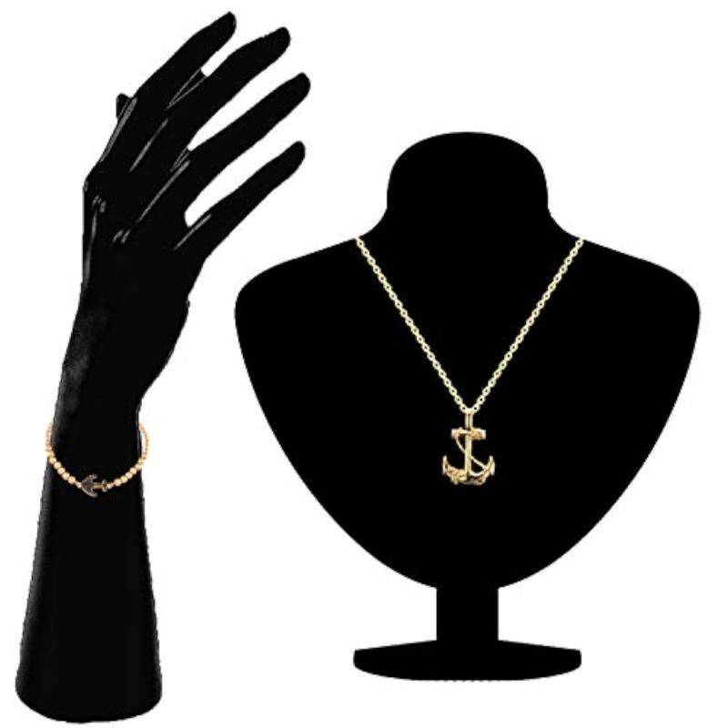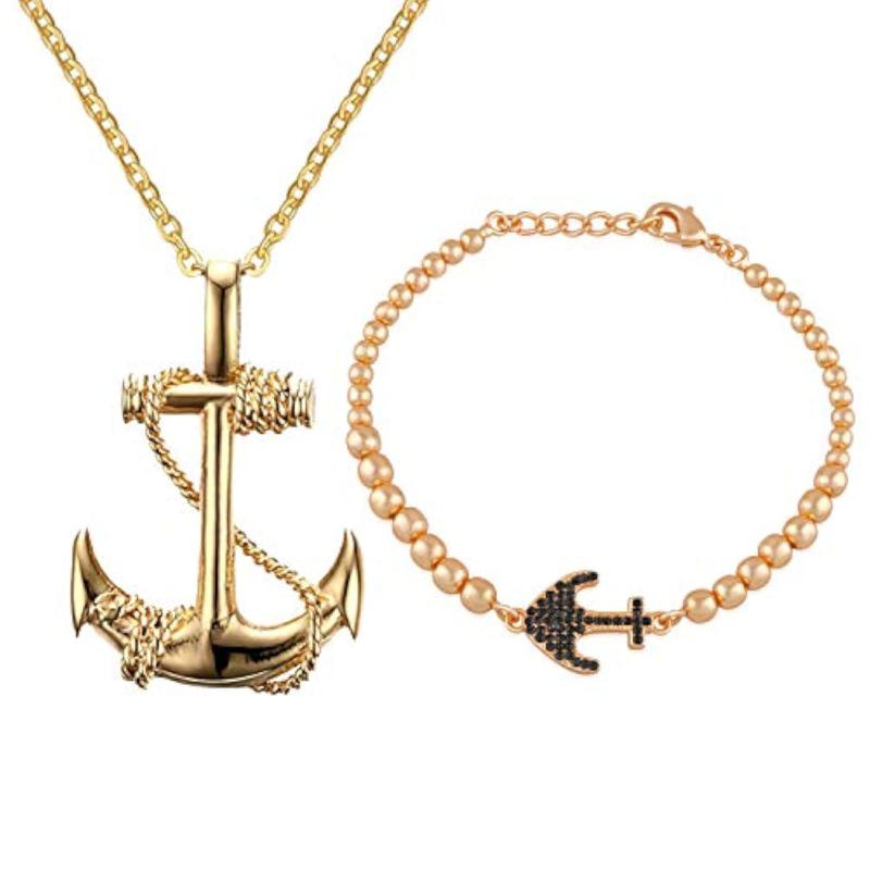 Elegant set featuring a crystal-embellished anchor charm on a sleek alloy bracelet and pendant.