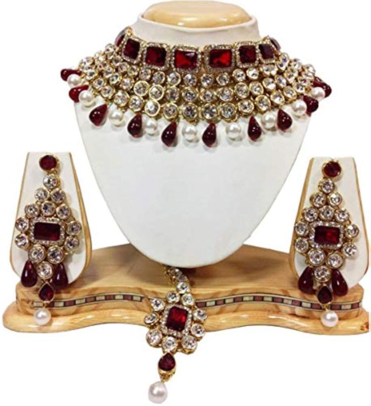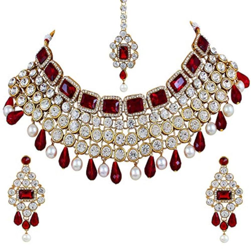 Elegant traditional jewelry set featuring a crystal choker with matching maang tikka and earrings.