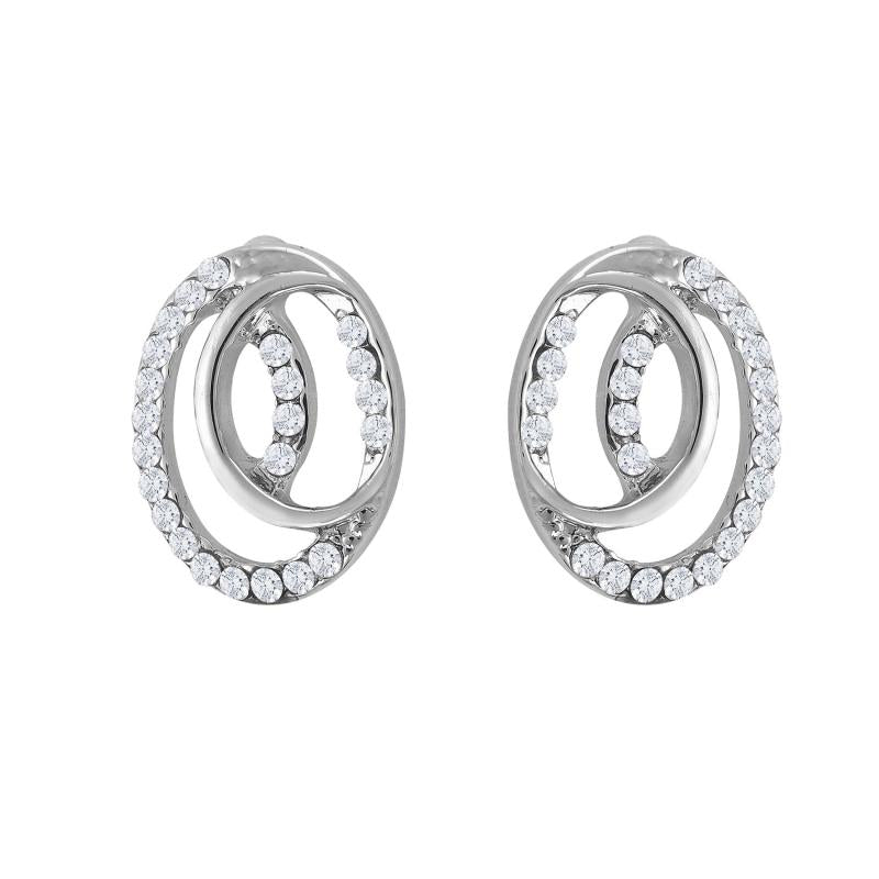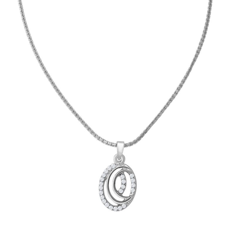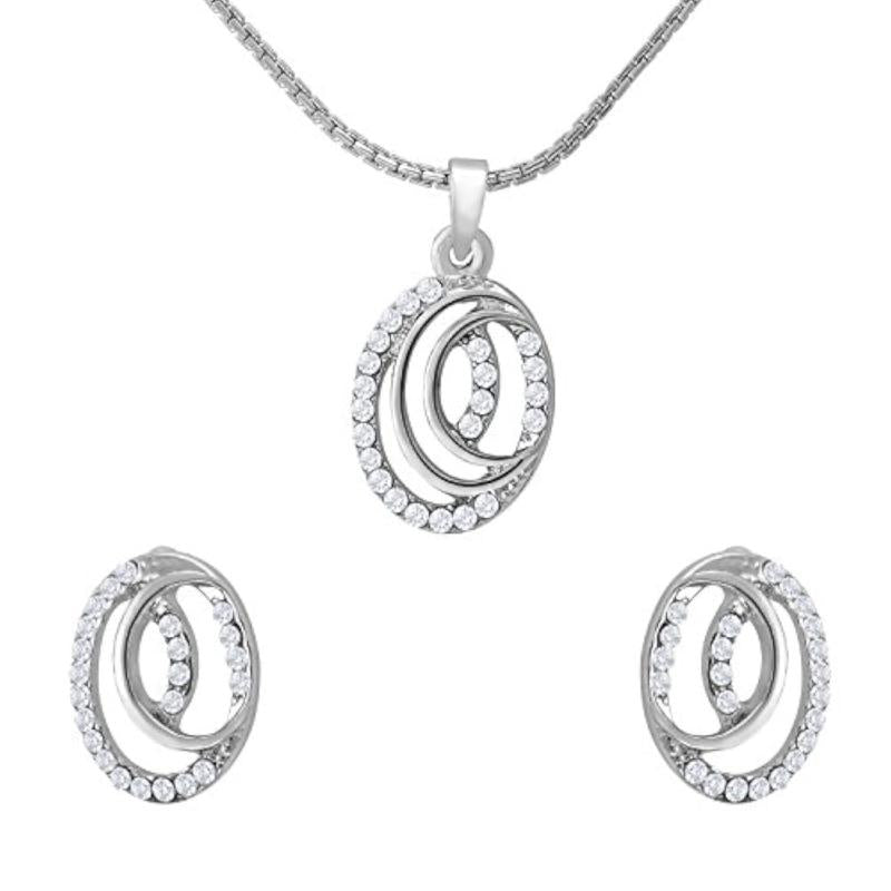 Elegant pendant set featuring dual oval design with sparkling crystals, plated with rhodium for a luxurious finish.