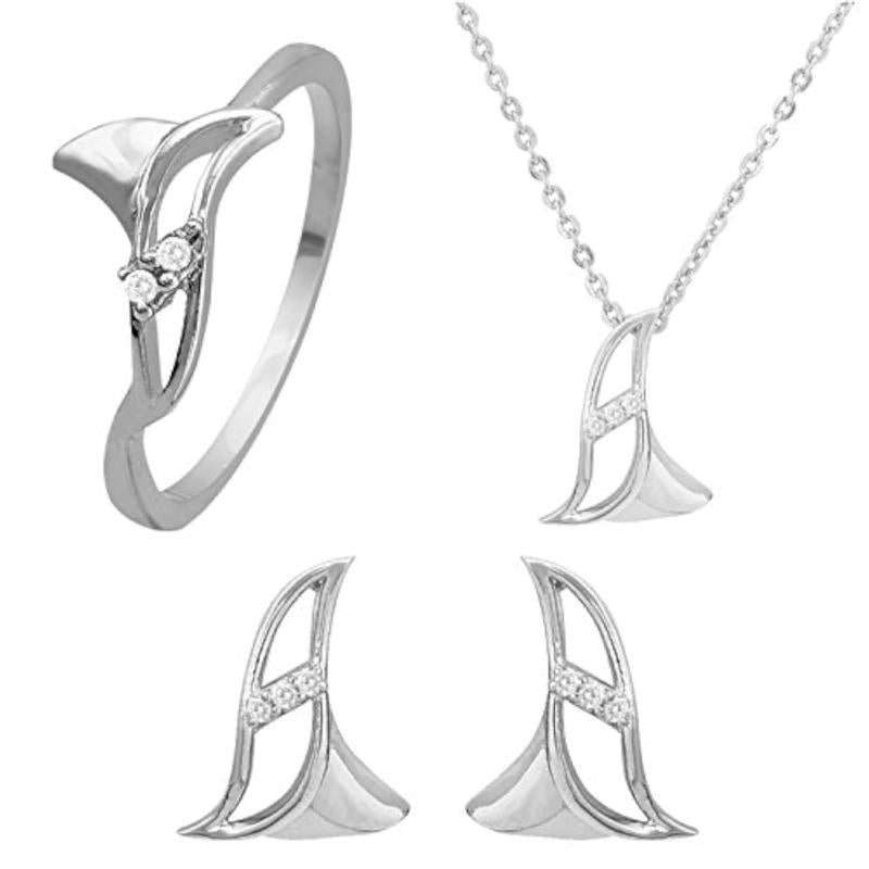Elegant floral lily pendant set and ring with CZ stones, beautifully crafted and rhodium plated for a stunning look.