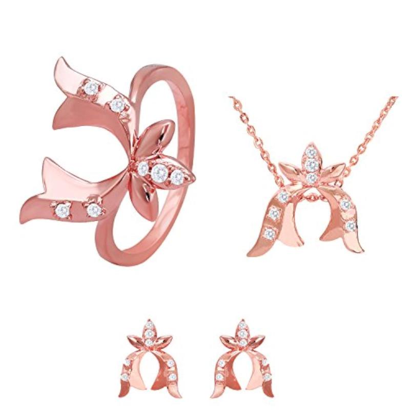Elegant set featuring a floral rose design with CZ stones, plated in a stunning finish.