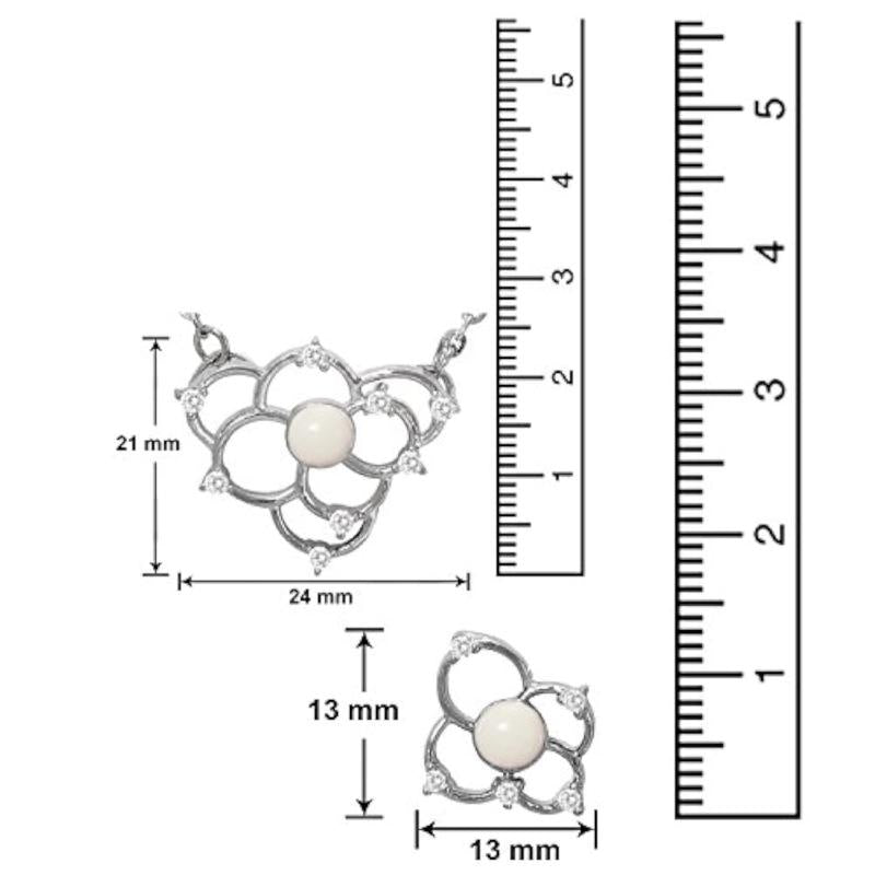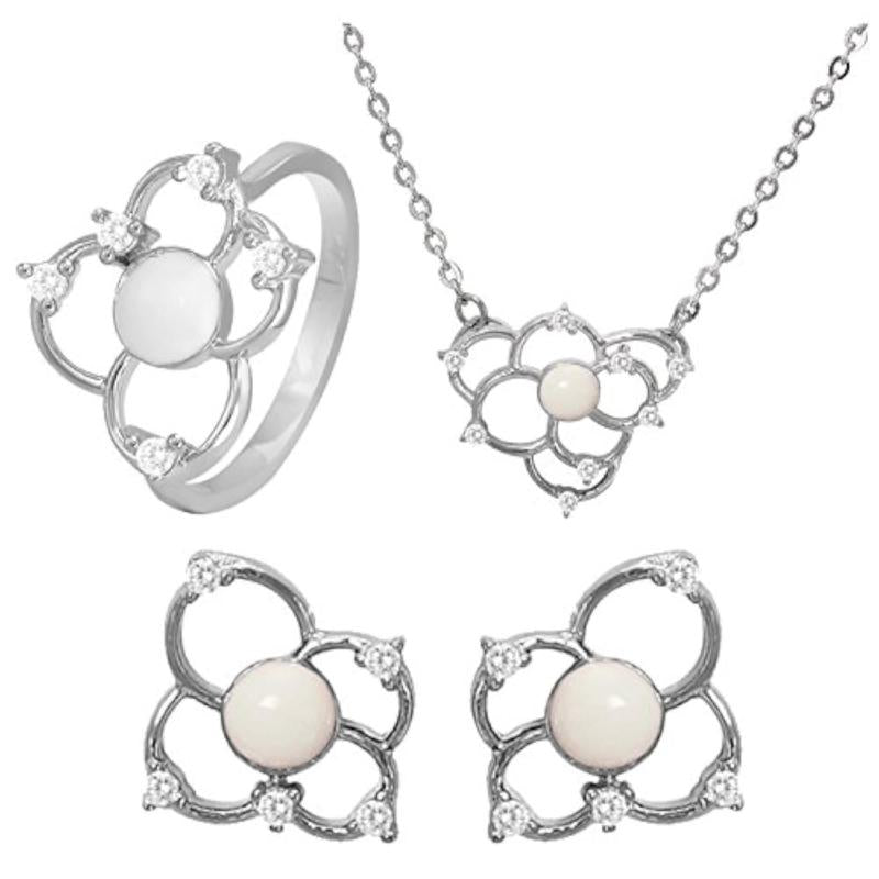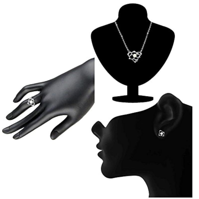 Elegant CZ flower pendant set with matching ring in rhodium plated finish. Perfect for formal or casual occasions.
