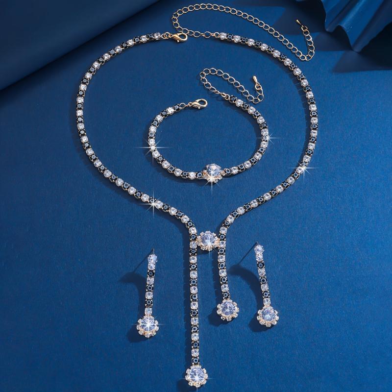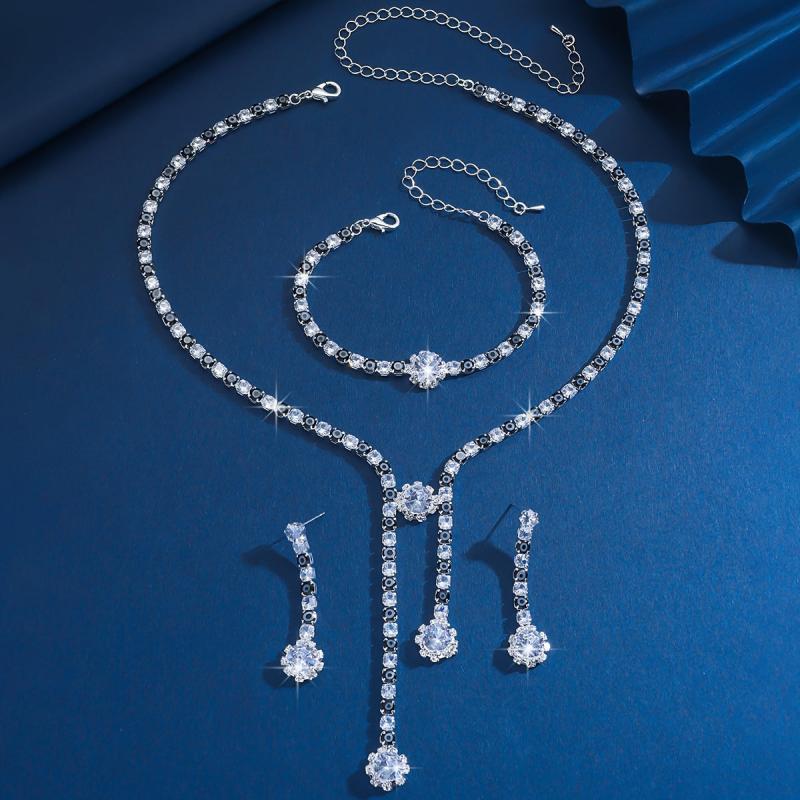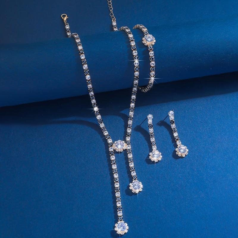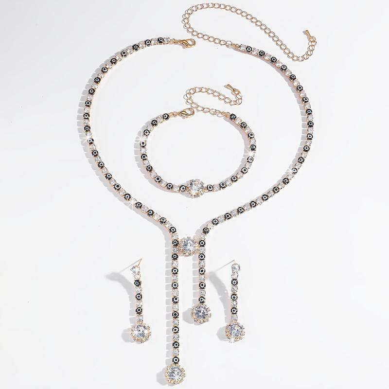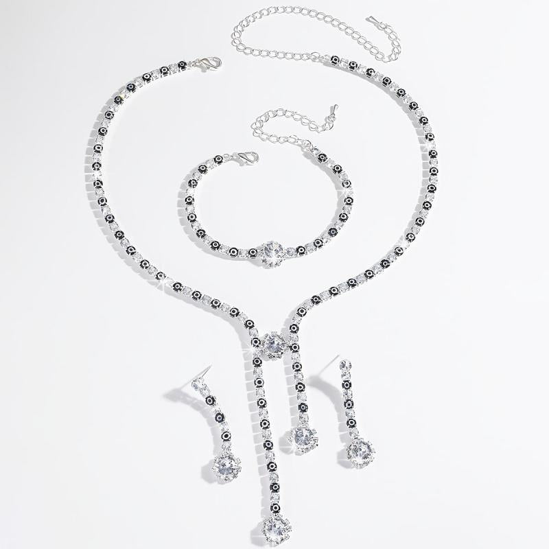 Complete your look with this three-piece jewelry set that includes a necklace, earrings, and bracelet. The set features a Death Eye design with rhinestones, all silvery plated in an exaggerated style. Perfect for holiday themes, parties, and daily wear.