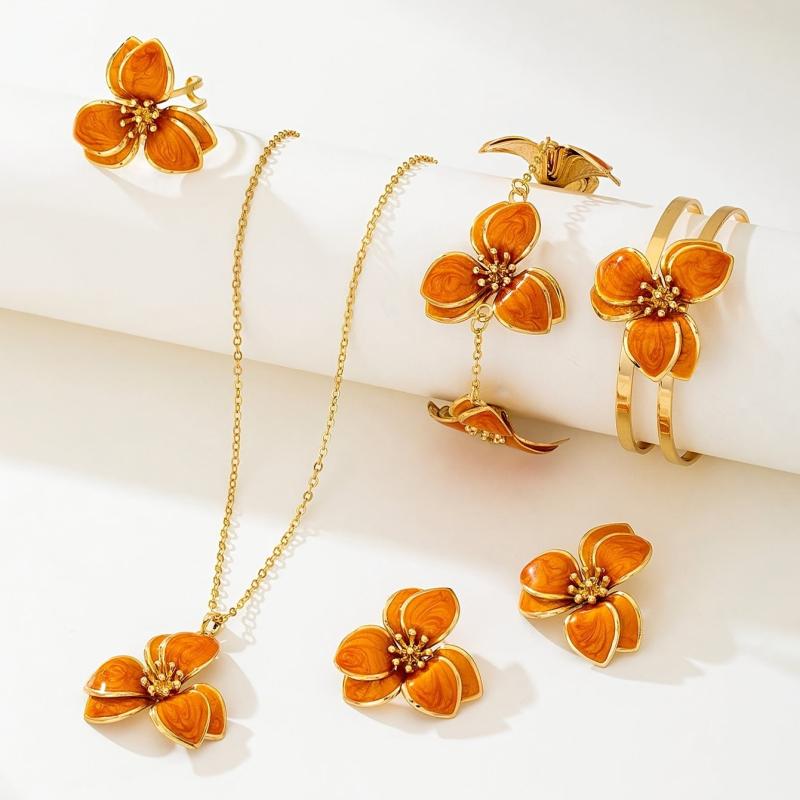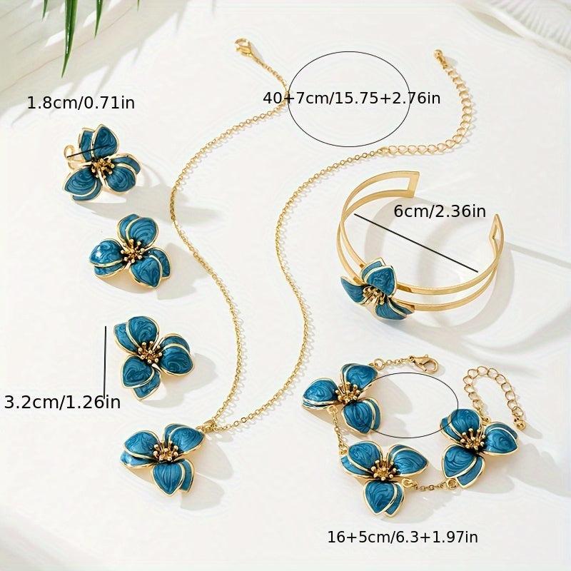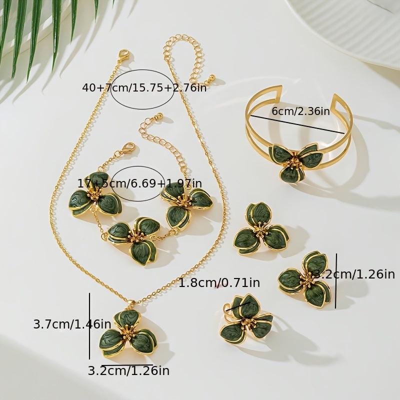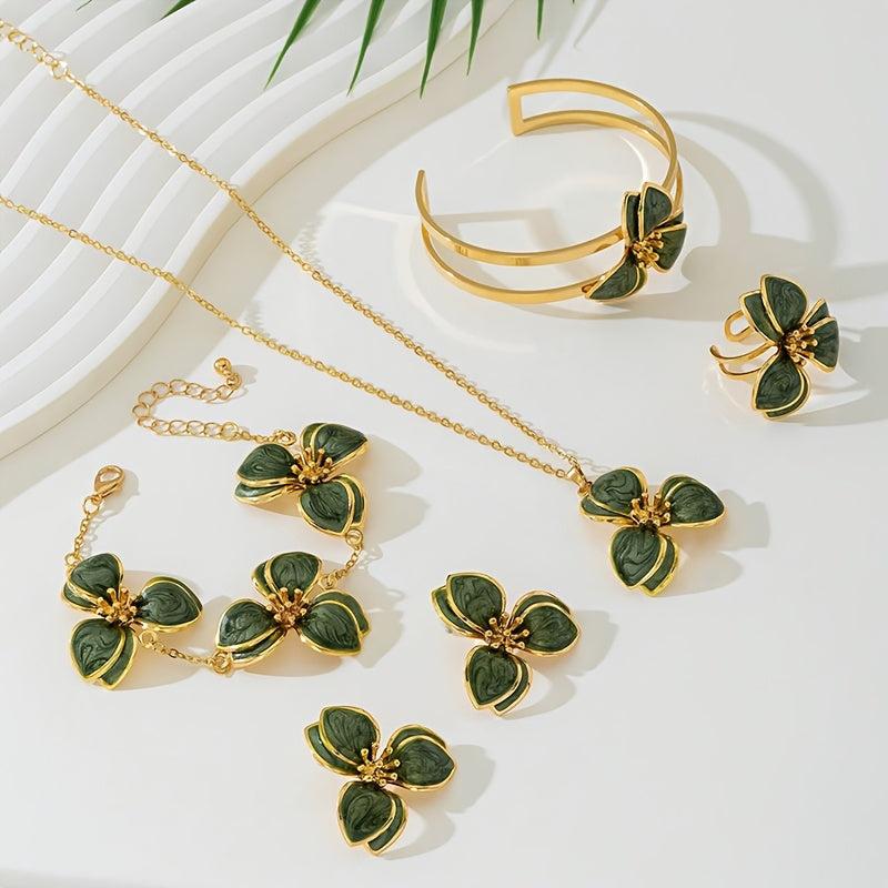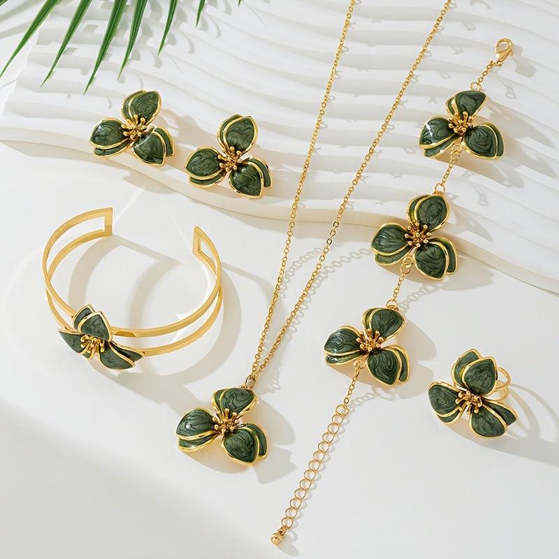Complete your look with this stunning five-piece jewelry set featuring a green floral pendant necklace, matching stud earrings, a stylish ring, and a chic bracelet.
