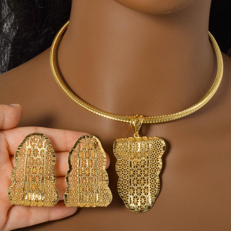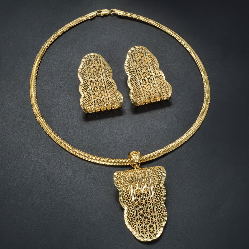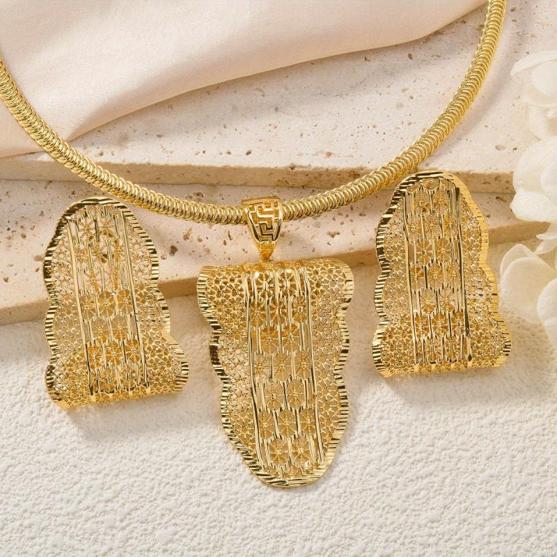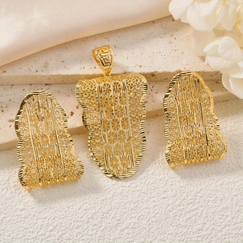 Complete your look with this stylish set of Middle Eastern Dubai jewelry featuring intricate banana leaf hollow pattern pendant earrings. Perfect for daily wear.