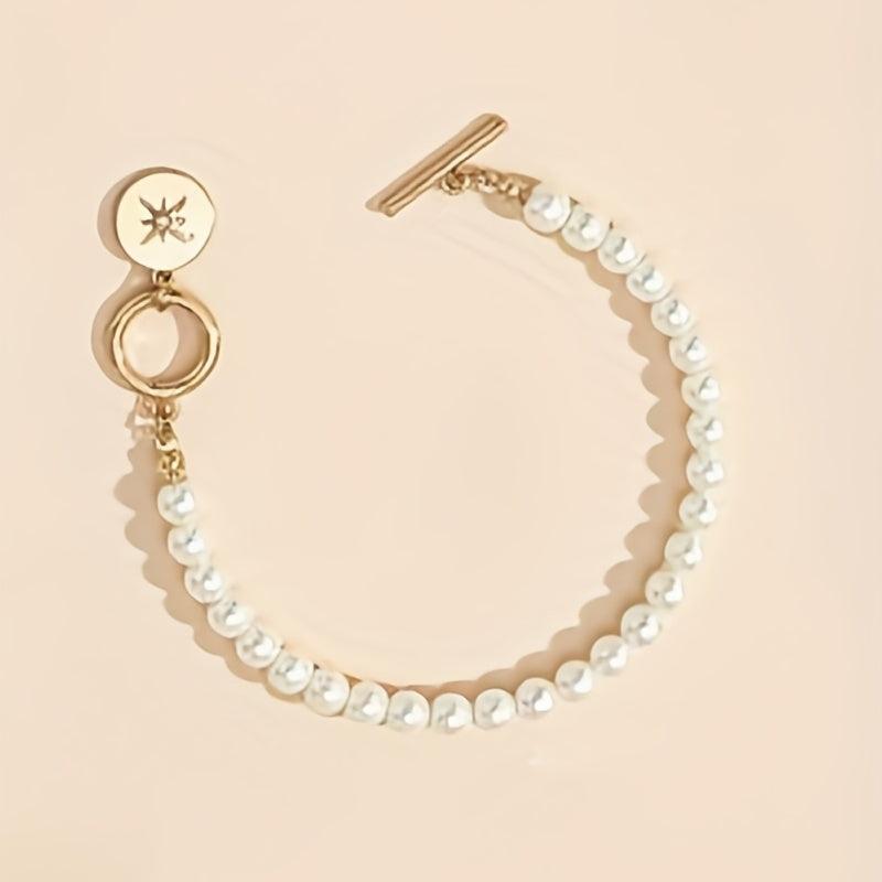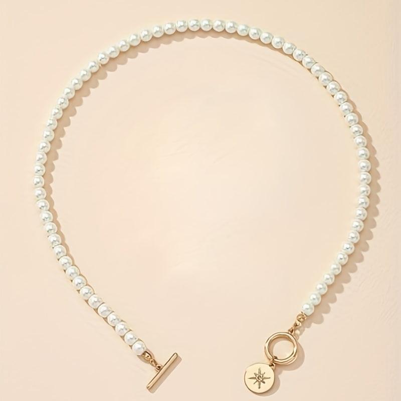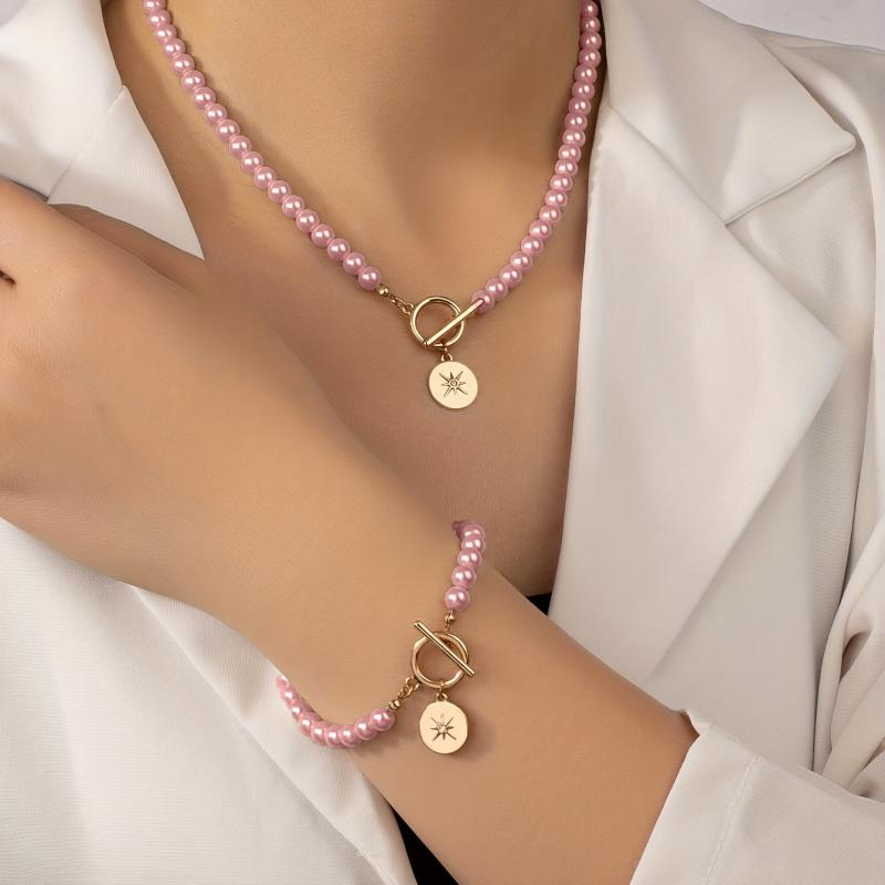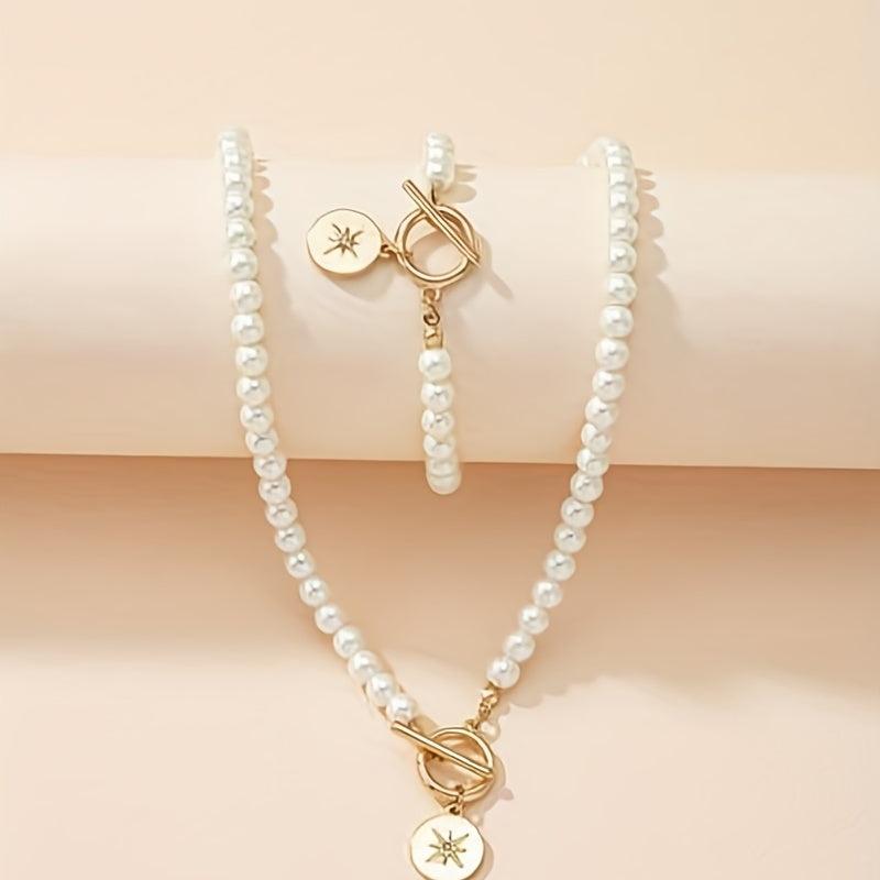 Complete your elegant look with this stunning pearl necklace and bracelet set featuring a beautiful wheat spike star pendant. Perfect for any occasion.