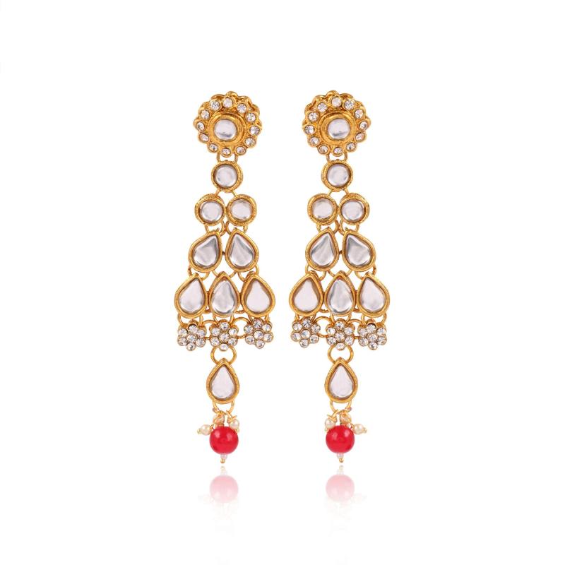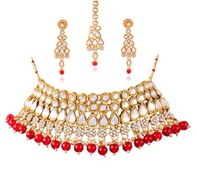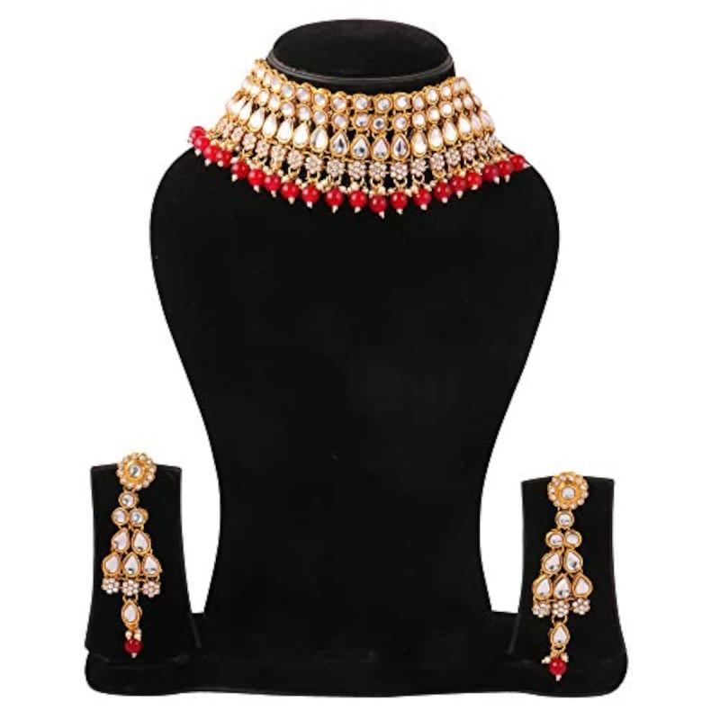 Enhance your wedding look with this elegant plated necklace set featuring intricate design and matching earrings.