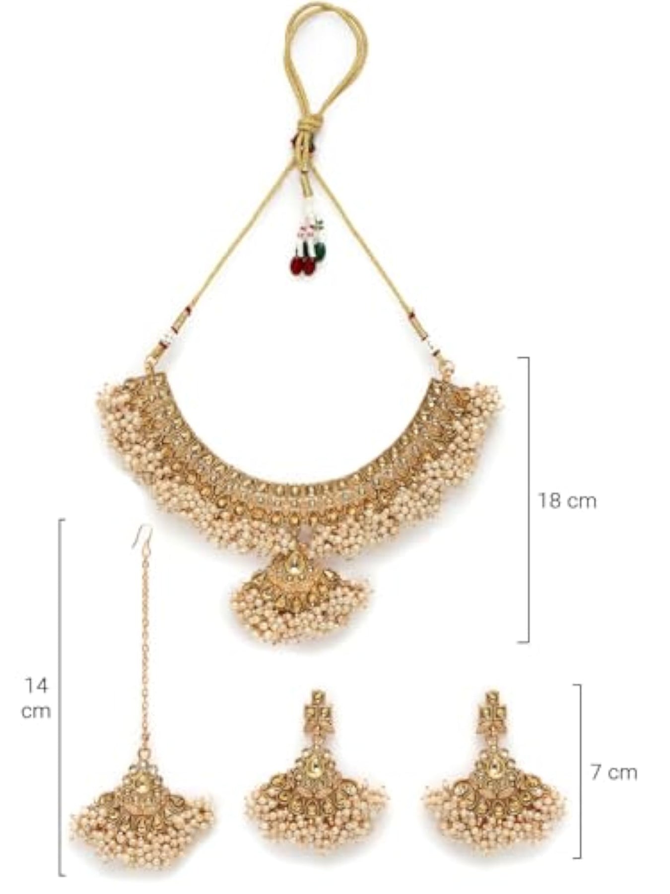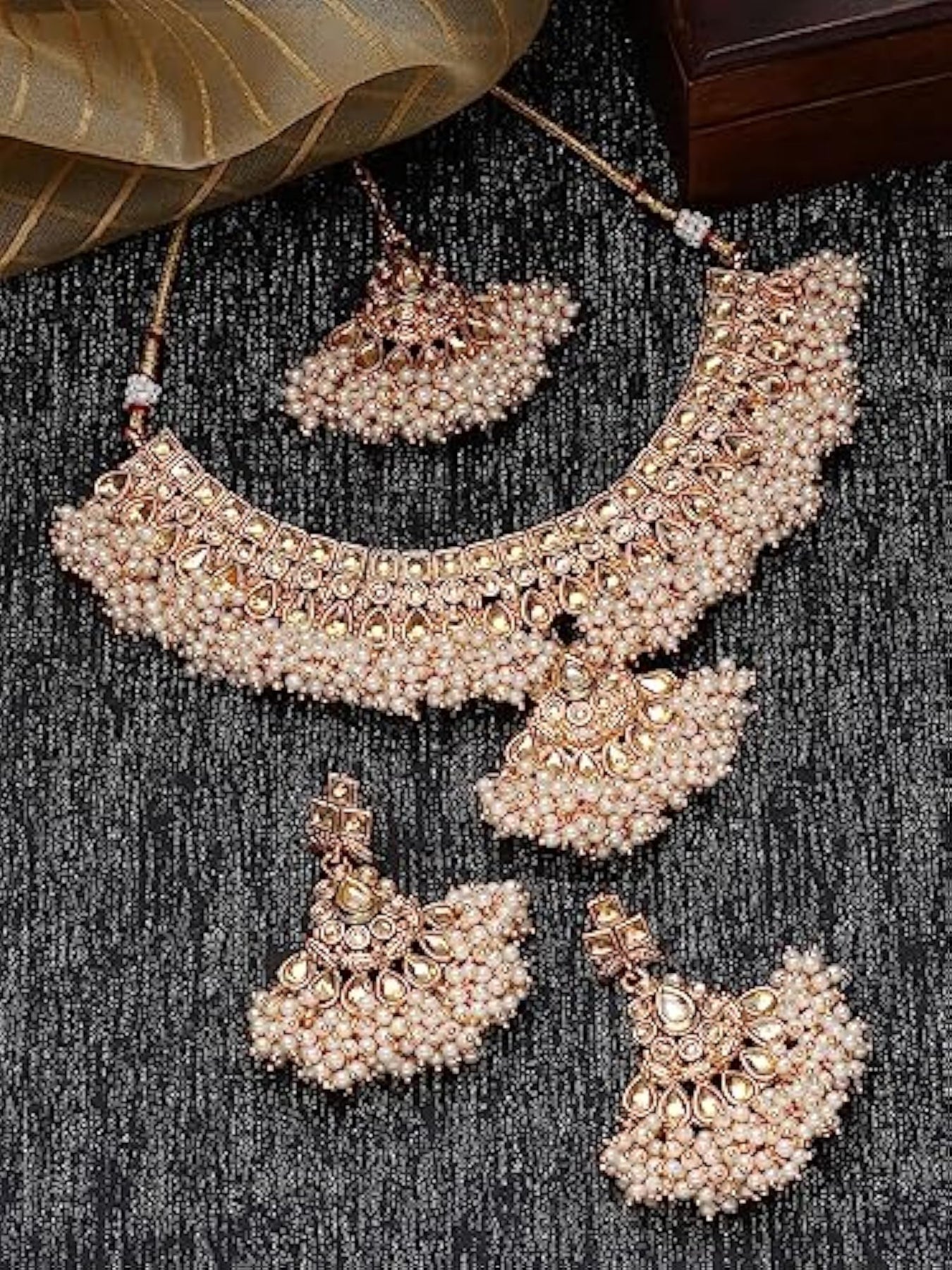 Beautifully crafted Ethnic Plated Kundan & Beads Copper Collar Bone Necklace Set adorned with earrings and maangtika. Perfect for special occasions.