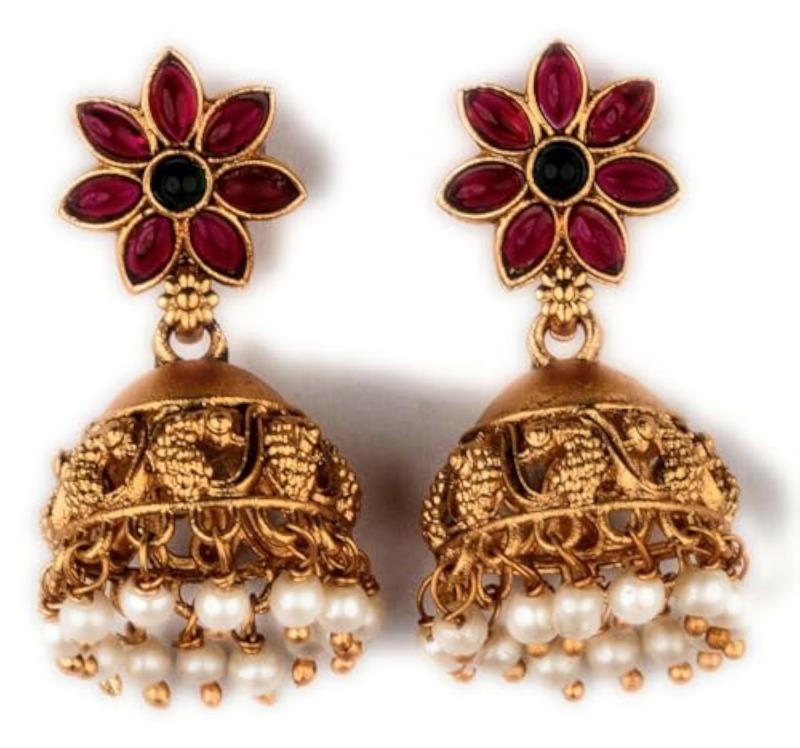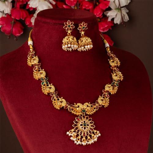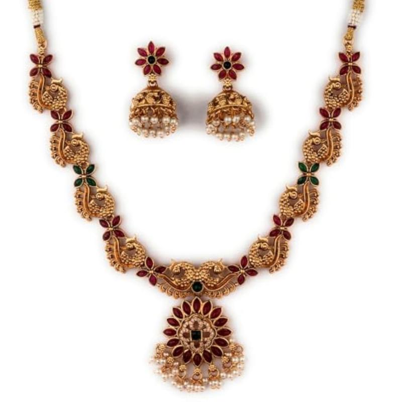 This traditional ethnic plated short necklace temple jewellery set is a stunning accessory for any occasion.