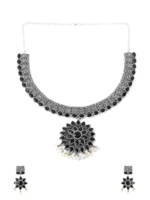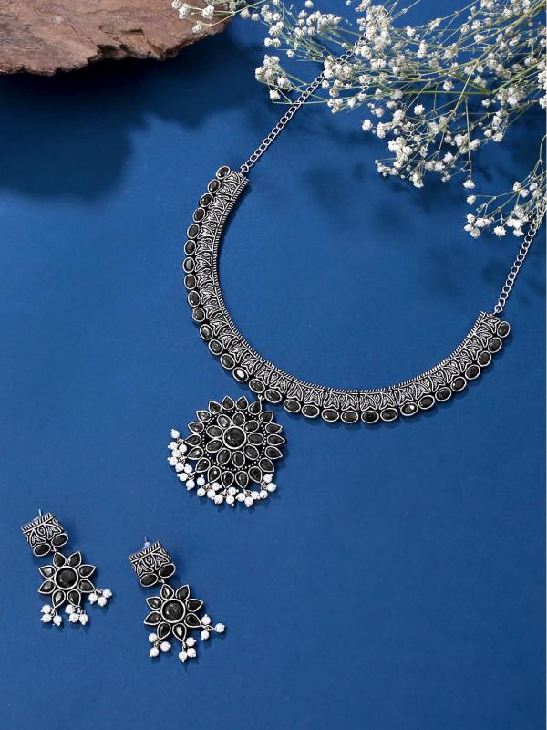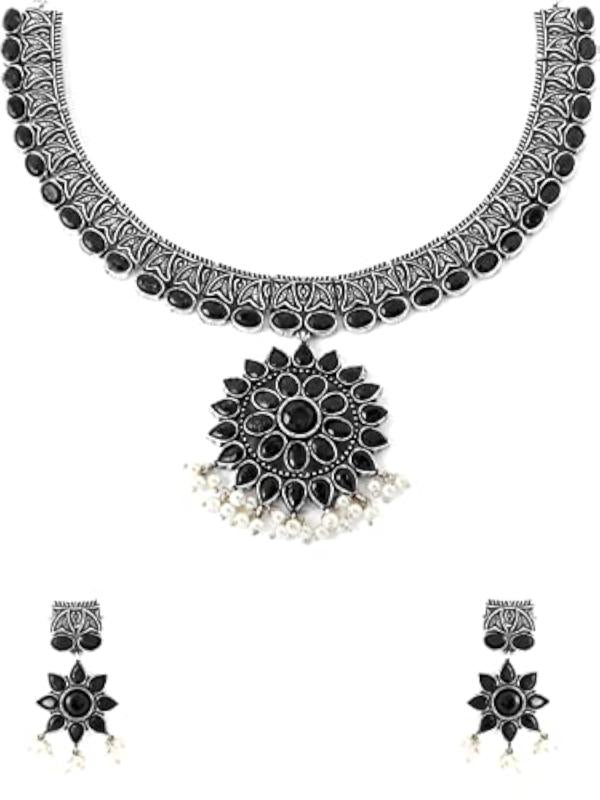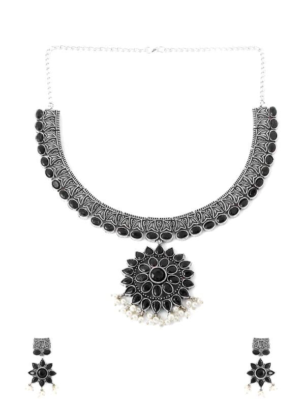 This oxidised silver jewelry set features a stunning choker necklace with intricate stone detailing, perfect for ethnic occasions.