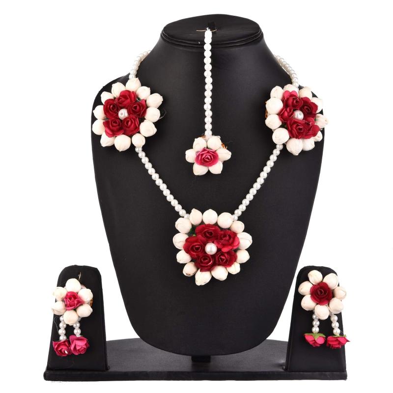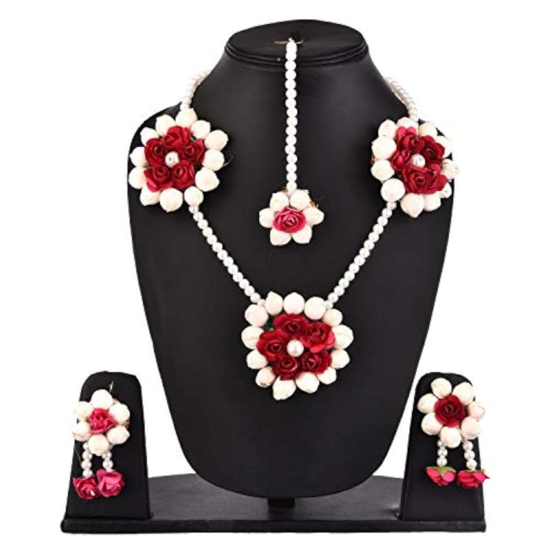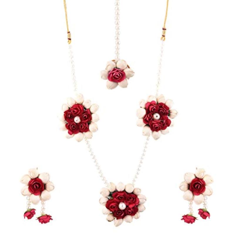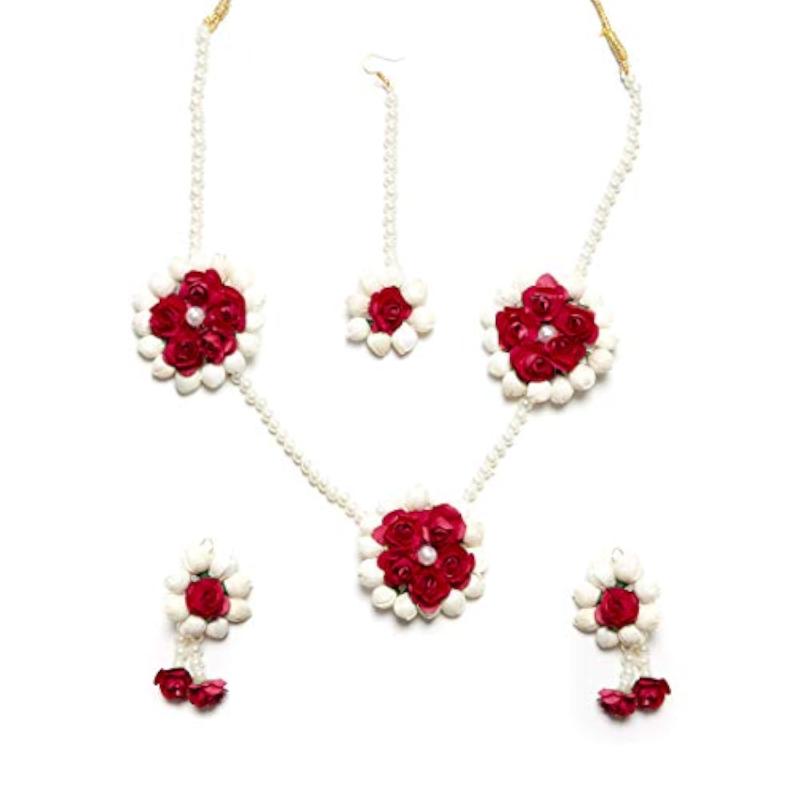 Elegant jewellery set featuring floret gota patti designs in a necklace, earrings, bracelet, and maang tika.