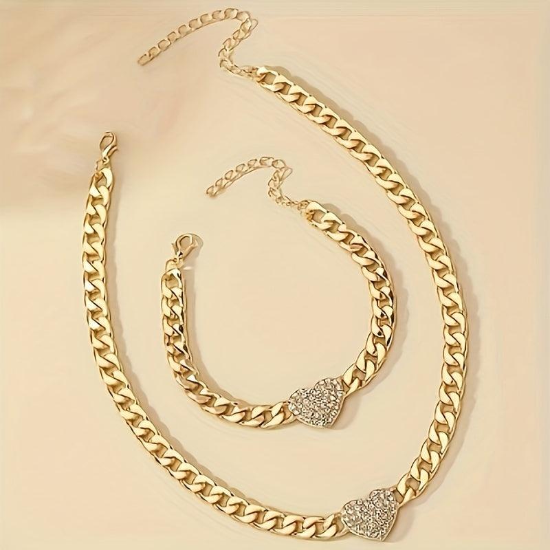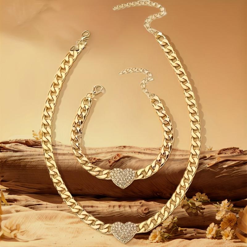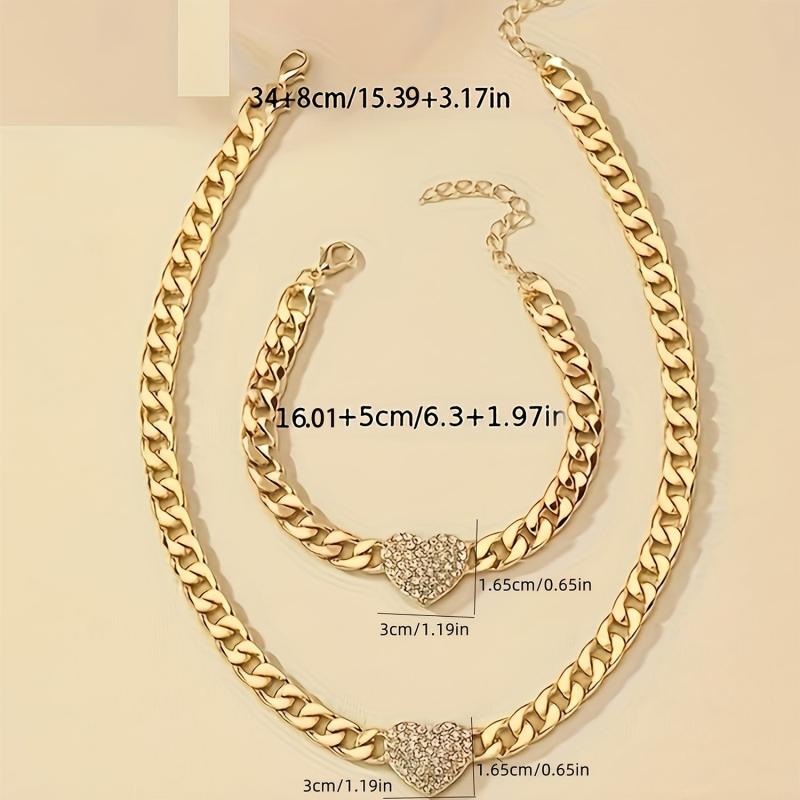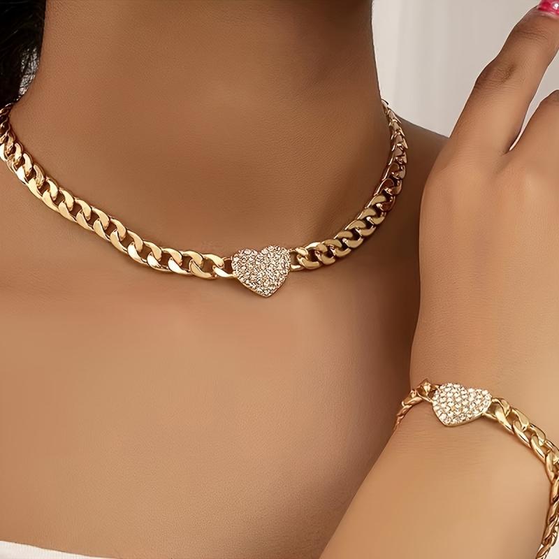 Elegant French retro jewelry set with heart-shaped pendant and bracelet, adorned with sparkling rhinestones. Perfect for daily wear or special occasions.