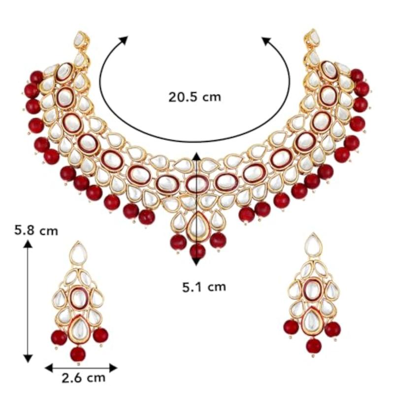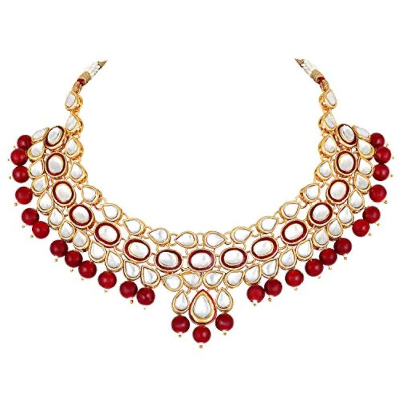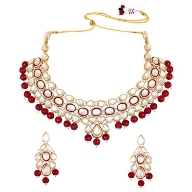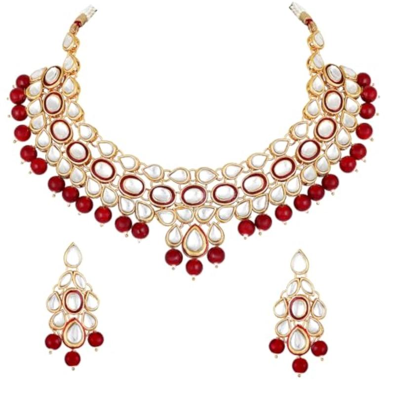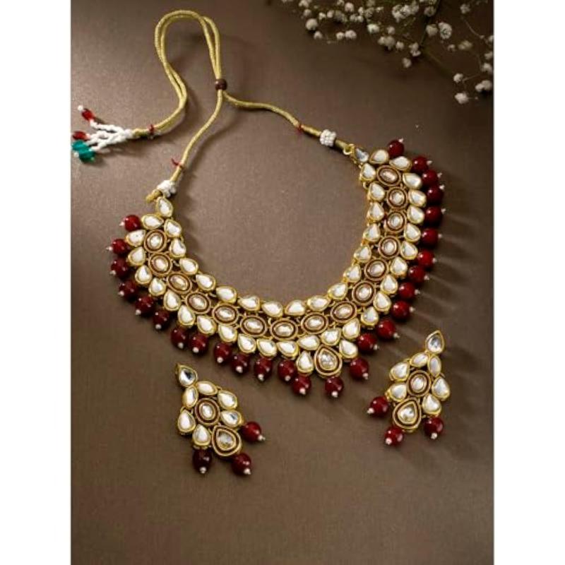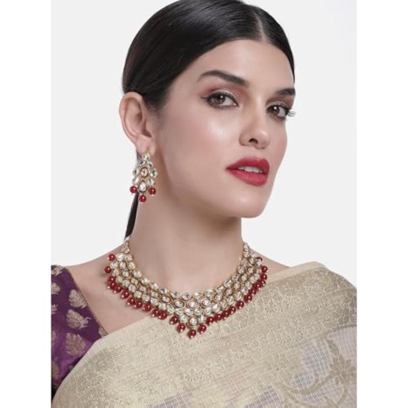 Make a statement with this elegant gold-plated brass necklace and earrings set featuring pearls and kundan. Perfect for special occasions.