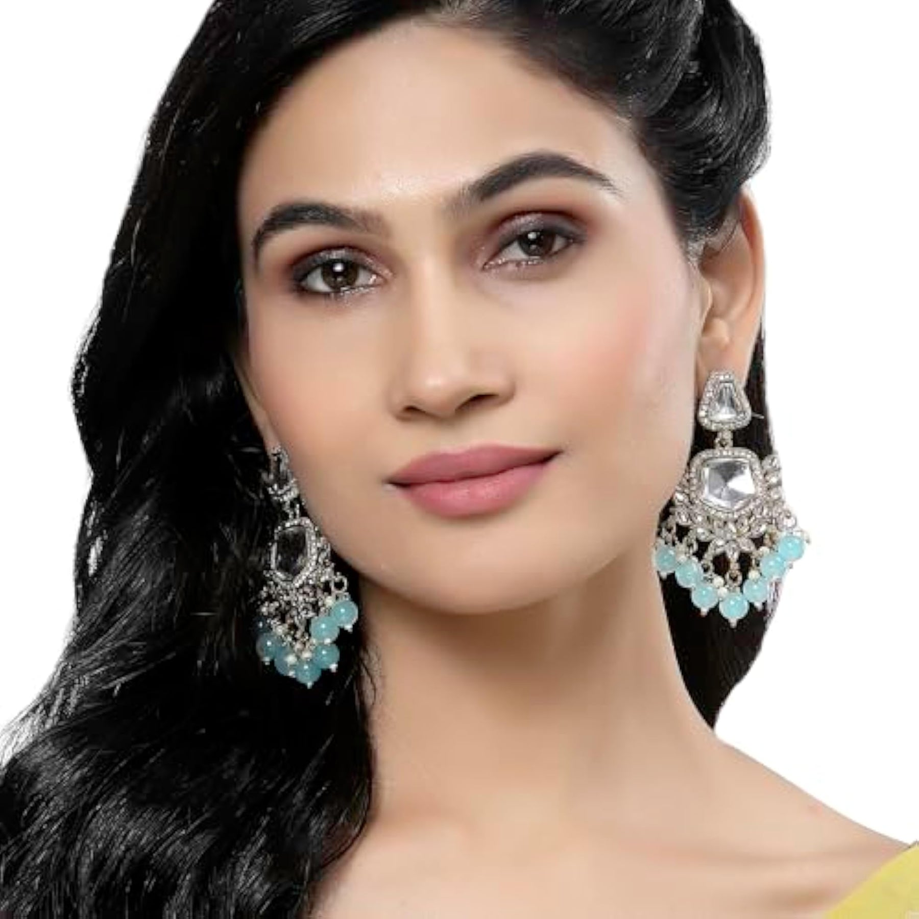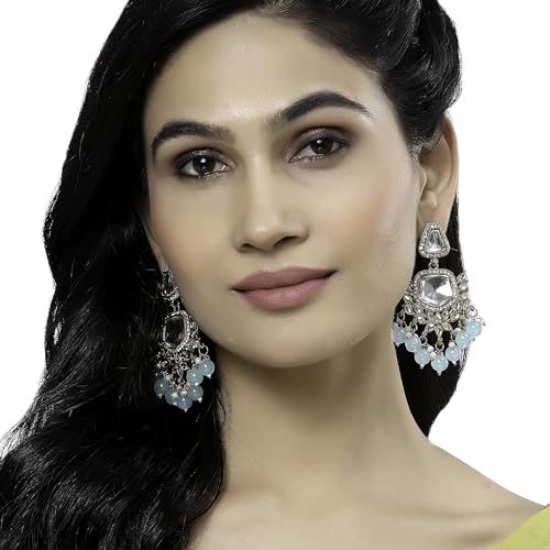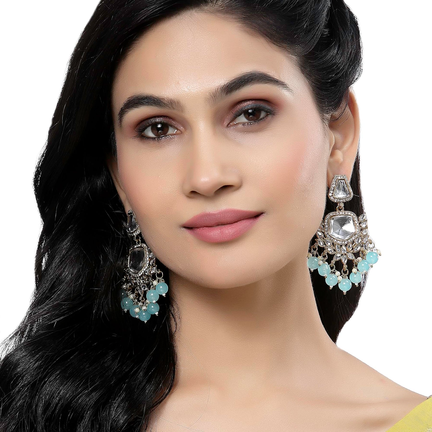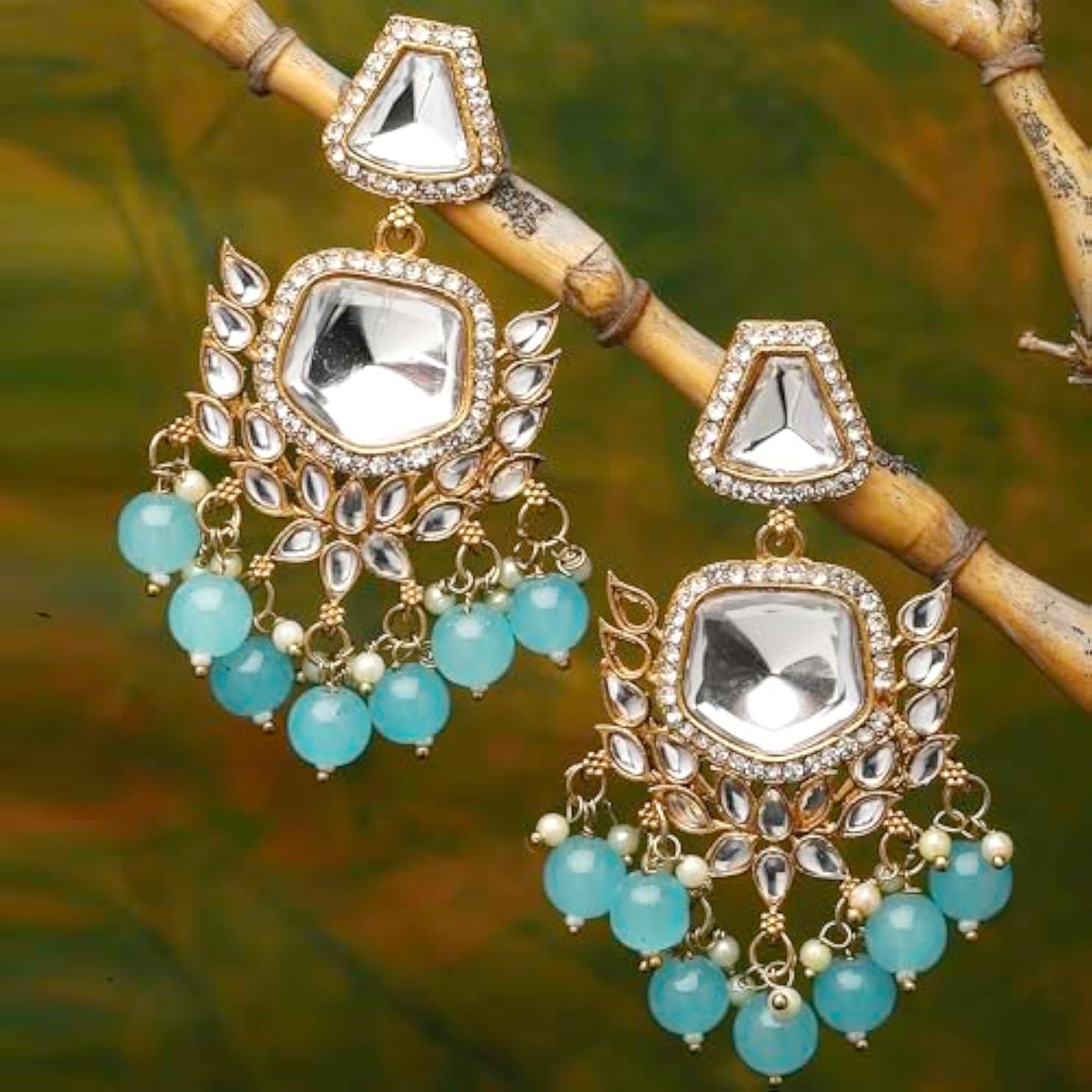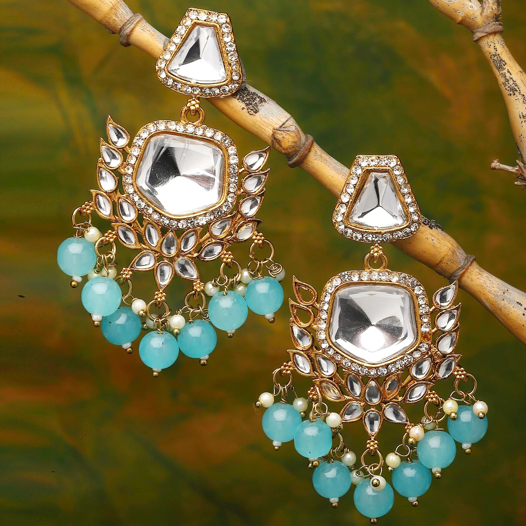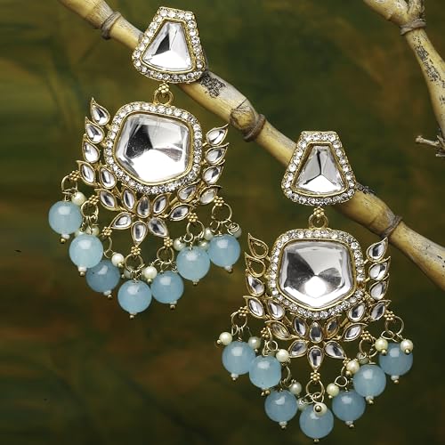 Elegant gold-plated earrings featuring kundan and pearls, with a classic mirror drop design.