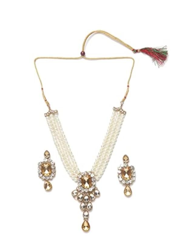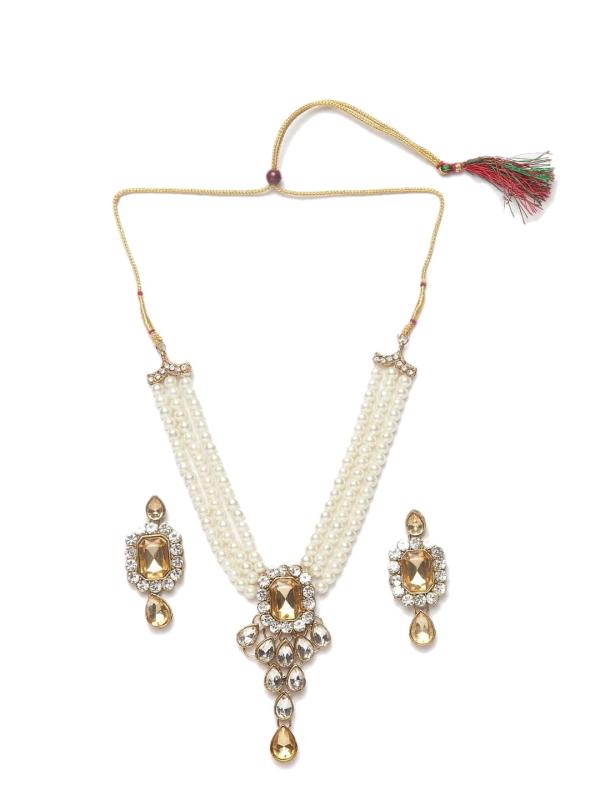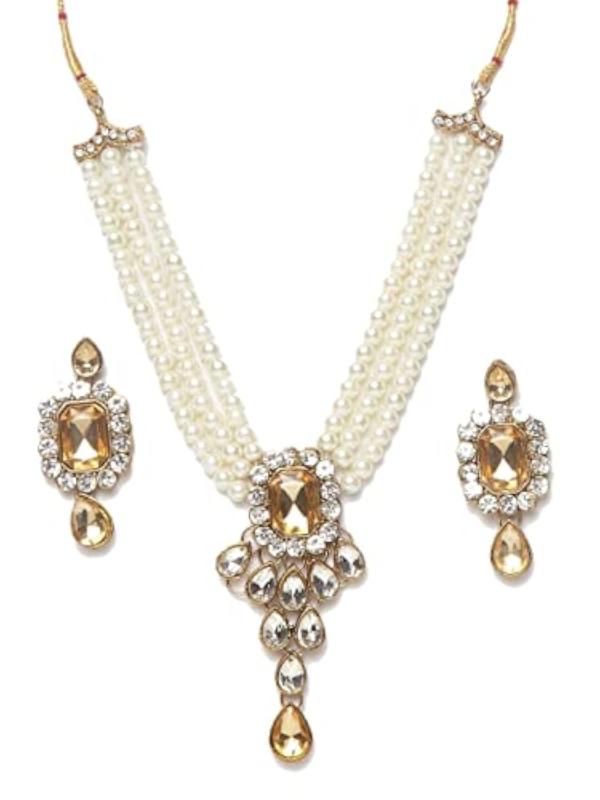 Elegant antique jewellery set with gold plating, kundan studs, and pearl beading. Perfect for special occasions.