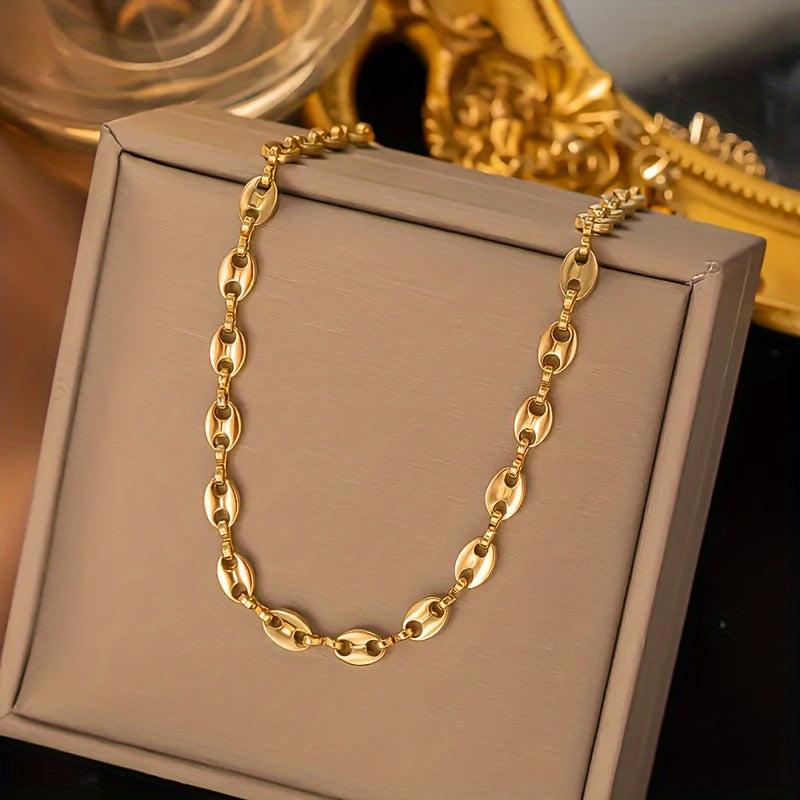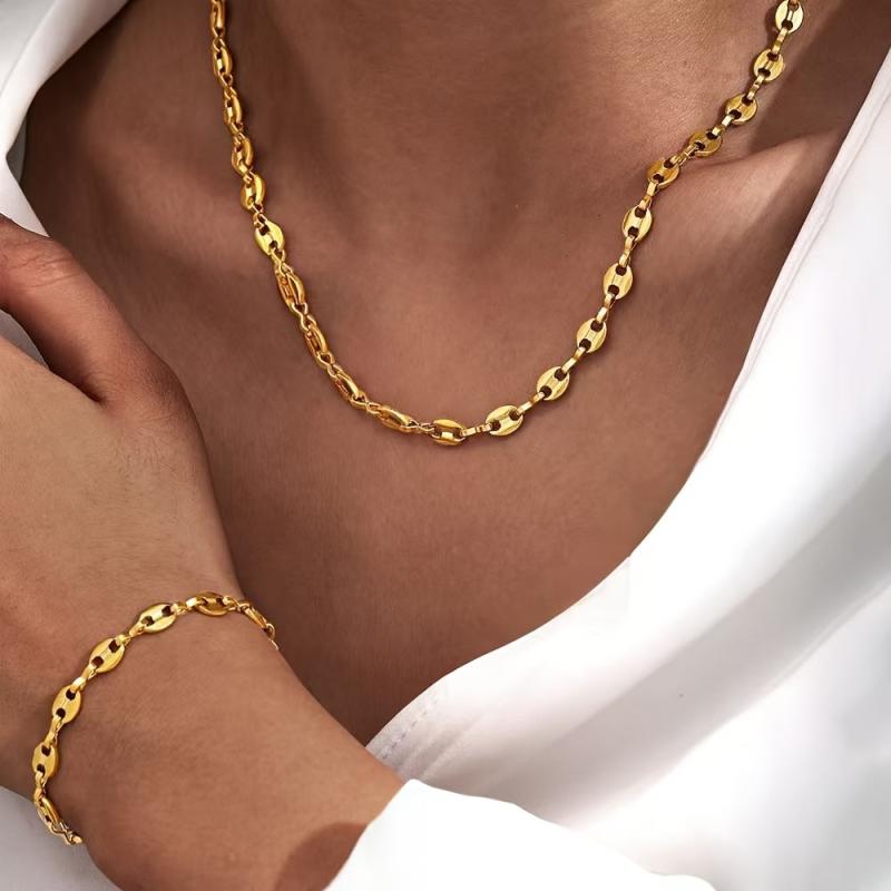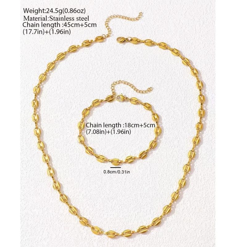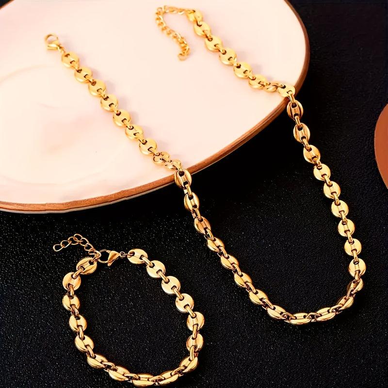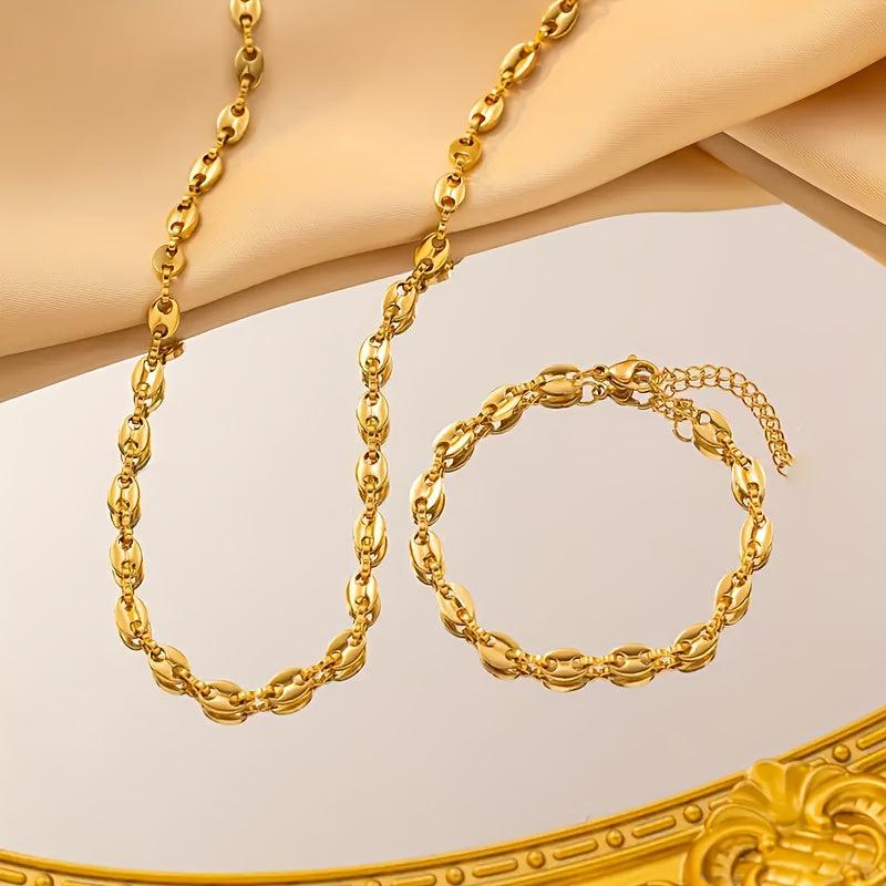 This set includes 2pcs of stylish and elegant golden necklace and bracelet, perfect for casual parties.