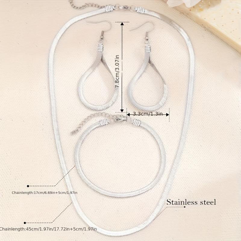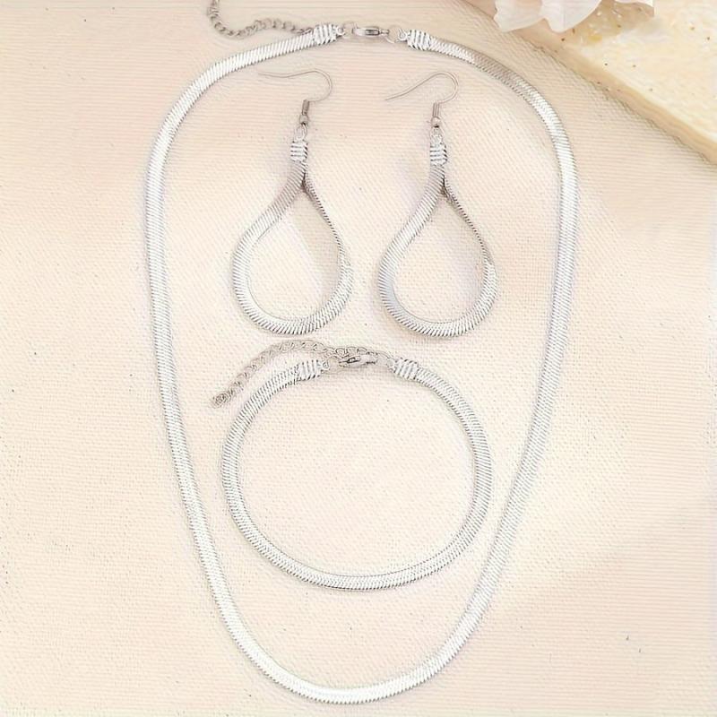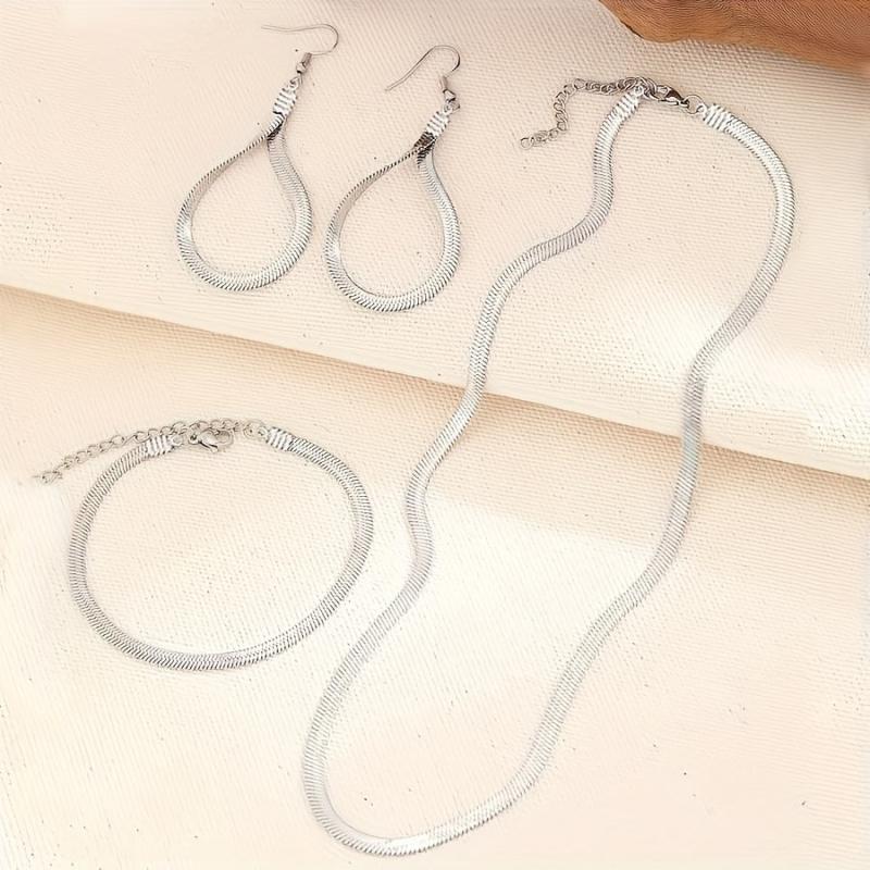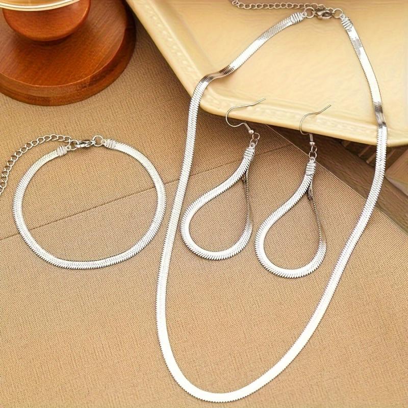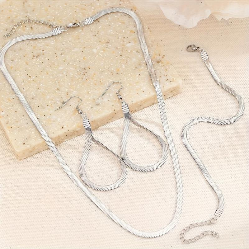 This silvery and unique set includes a necklace, clavicle chain, bracelet, and earrings, perfect for hip hop style lovers.